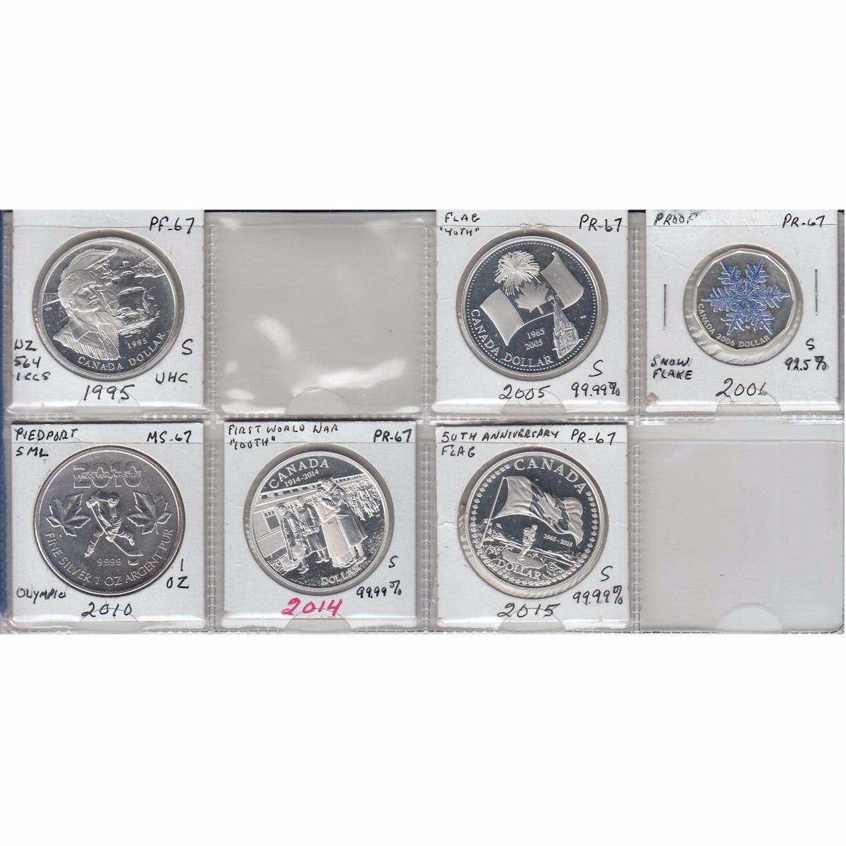 Mixed Page of 6x Canada Commemorative Proof Silver $1 & $5 Dated 1995, 2005, 2006 Snowflake, 2010 Hockey $5, 2014 & 2015. 6pcs