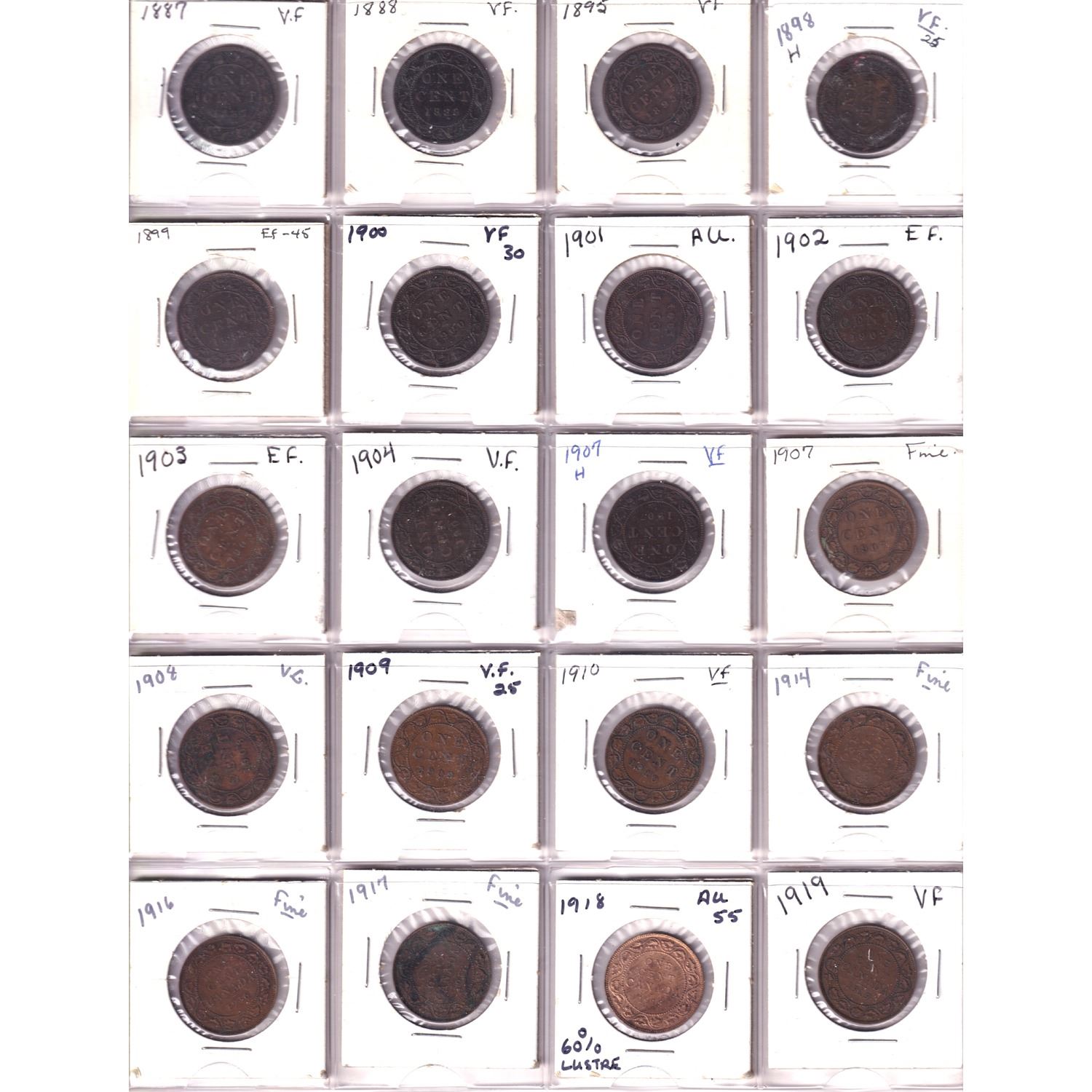 Mixed Page of Canadian Large cent dated between 1887-1919. You will receive 20 pieces in this collection from dated between 1887-1919. Please view image for details. 20pcs.
