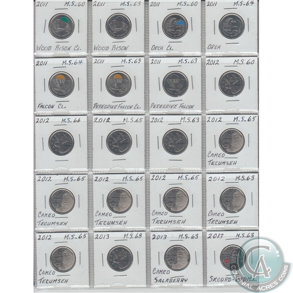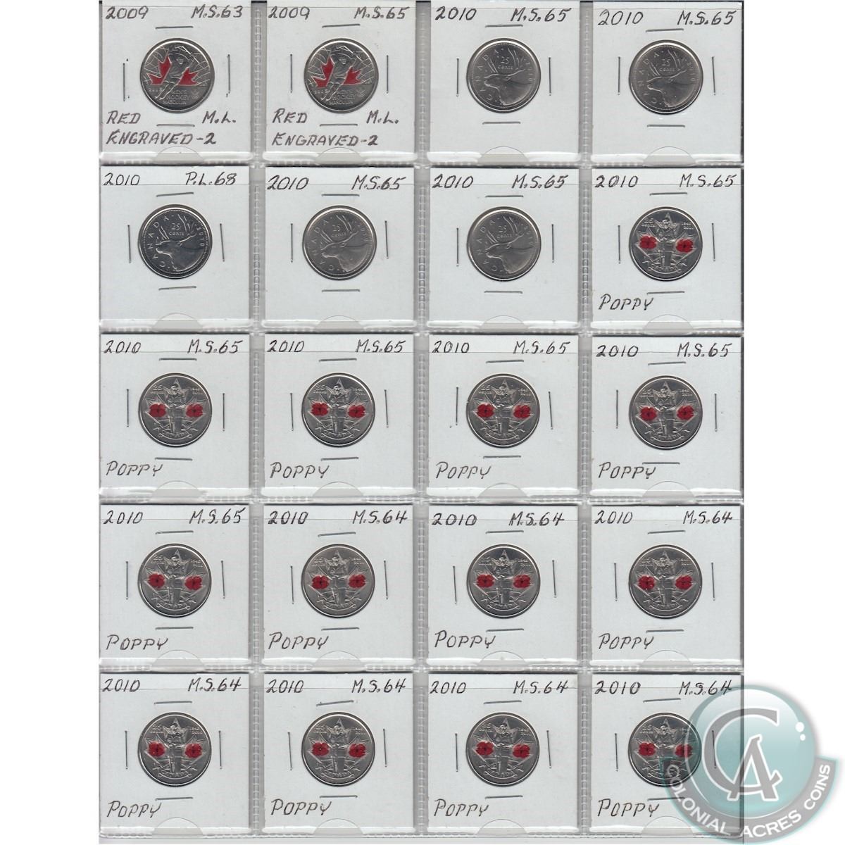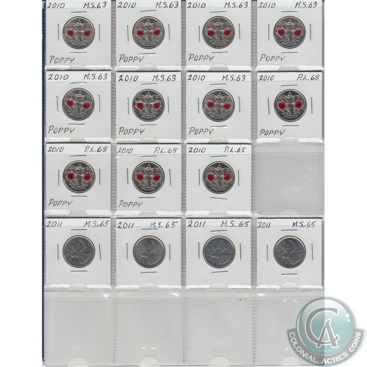 Mixed Pages of 55x various 2009-2013 Canadian 25-cent Coins. This Lot includes: 2x 2009 Mens Hockey Engraved 2 25-cent, 5x 2010 Caribou 25-cent, 24x 2010 Coloured Poppy 25-cent, 4x 2011 Caribou 25-cent, 1x 2011 wood Bison Coloured 25c, 1x 2011 Wood bison Non-coloured 25c , 1x 2011 Orca Coloured 25c, 1x 2011 Orca Non-coloured 25c, 2x 2011 Peregrine falcon Coloured 25c, 1c 2011 Peregrine Falcon non coloured, 3x 2012 Caribou 25c, 6x 2012 Tecumseh non-coloured 25-cent, 1x 2013 caribou 25-cent, 1x 2013 Salaberry non Coloured, and 1x 2013 Laura Secord coloured 25-cent coin (55 coins total)