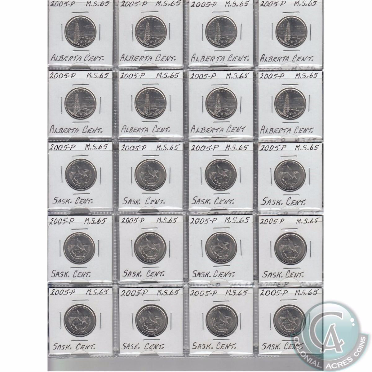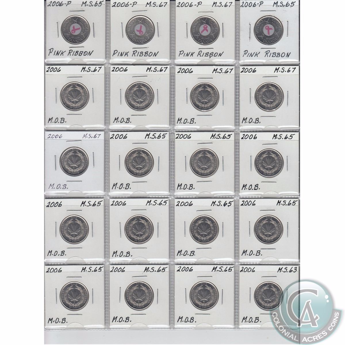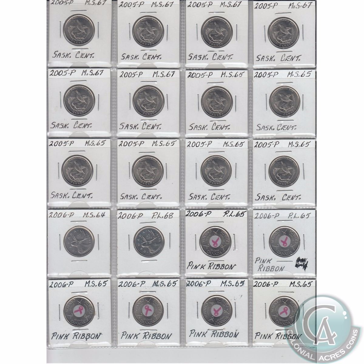 Mixed Pages of 60x 2005-2006 Canadian Commemorative Quarters. You will receive the following: 8x 2005P Alberta, 24x 2005P Saskatchewan, 2x 2006P Caribou, 10x 2006P Coloured Pink Ribbon, and lastly, 16x 2006 Medal of Bravery. Pages sold as is. (60pcs)