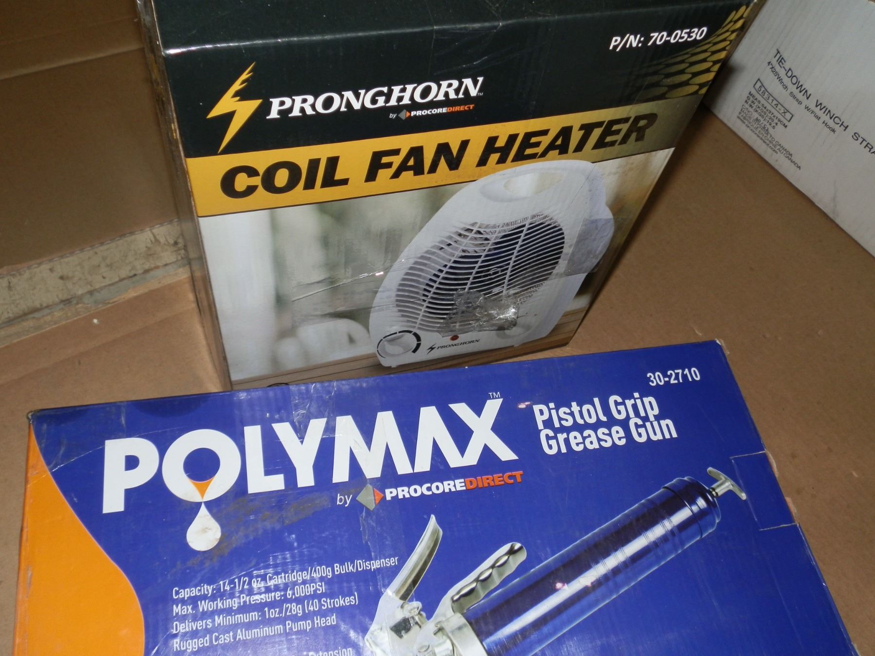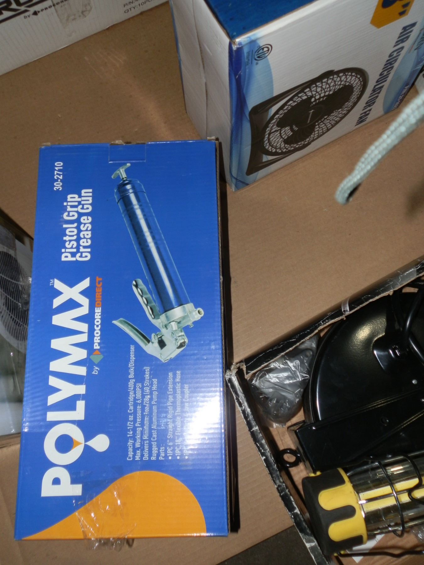 Mixed Lot, you get...small fan, coil fan heater, welding rod warmer, pistol grip grease gun, small work light, sprayer, suction gun, small sling, heating tool, drill bits, small truck mirrors, 5th wheel plug, and some soap dispensers all for one money...New/Used