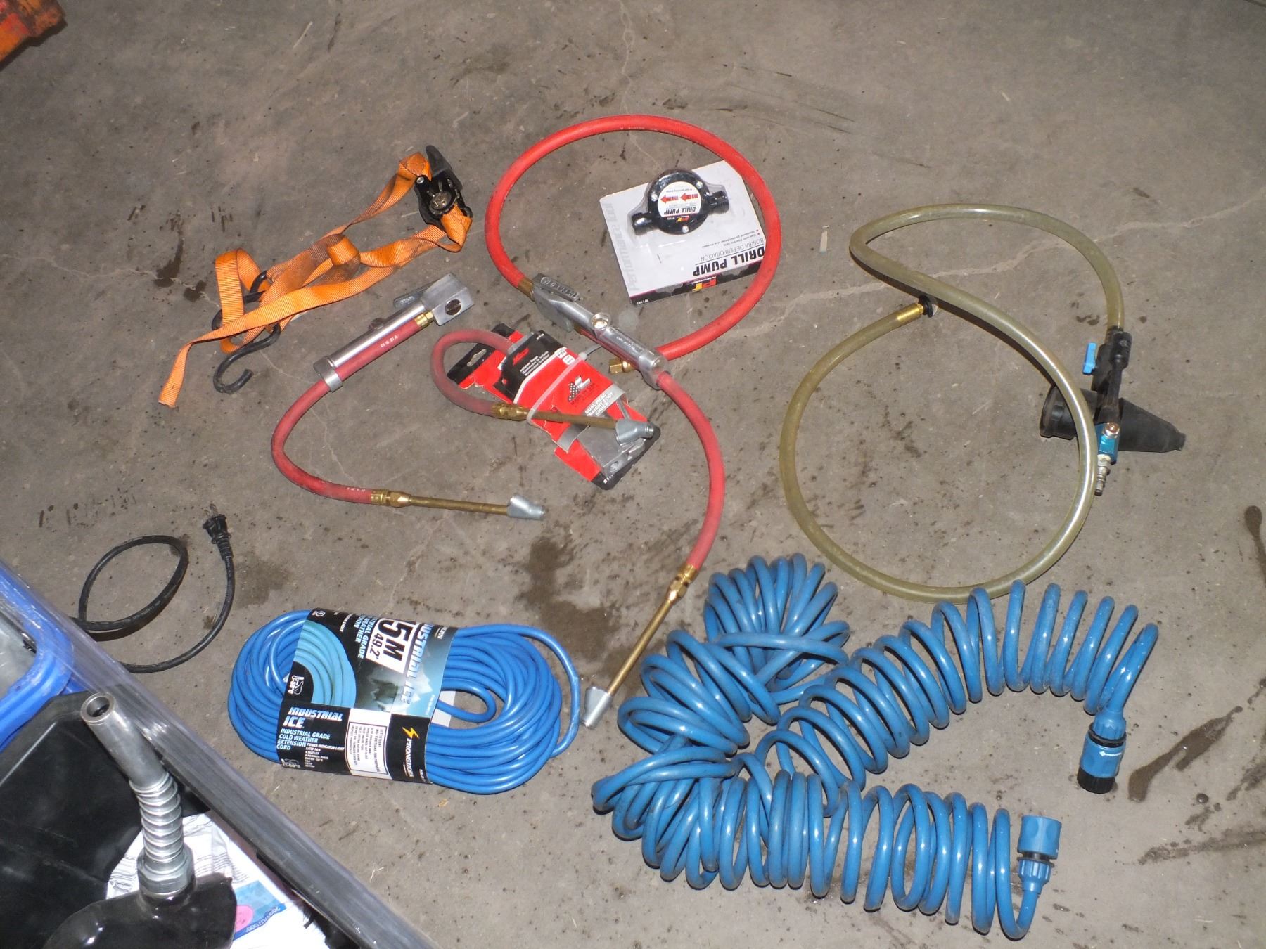 you get the whole pallet for one money, hammers, boots size 7, extension cords, air hose, air chuck, small hand tools, paint sprayer, brad nailer, fuel nozzle, grease gun, drill pump, suction pump, space heater and more....new/used