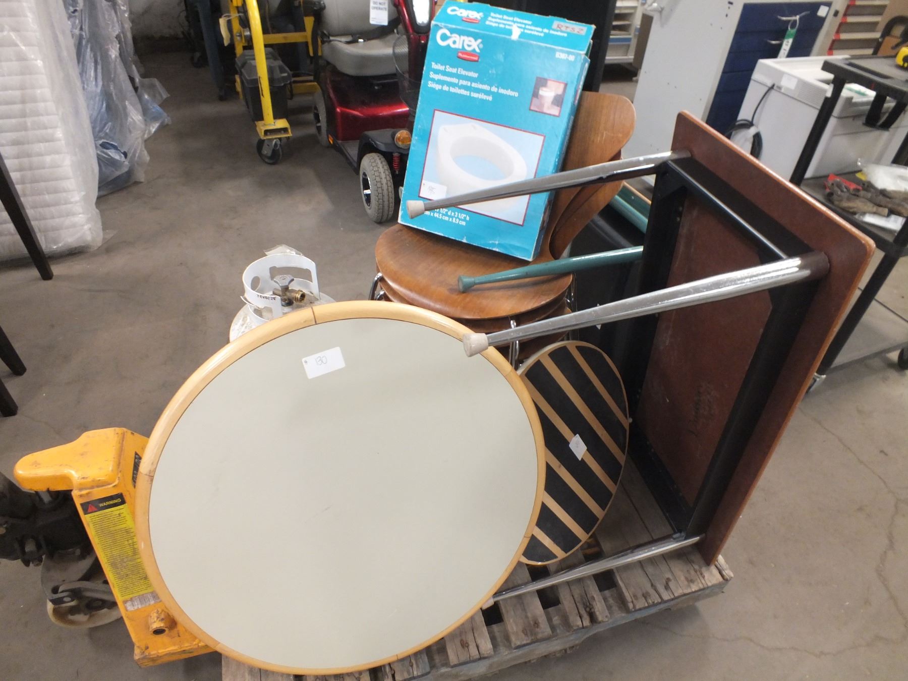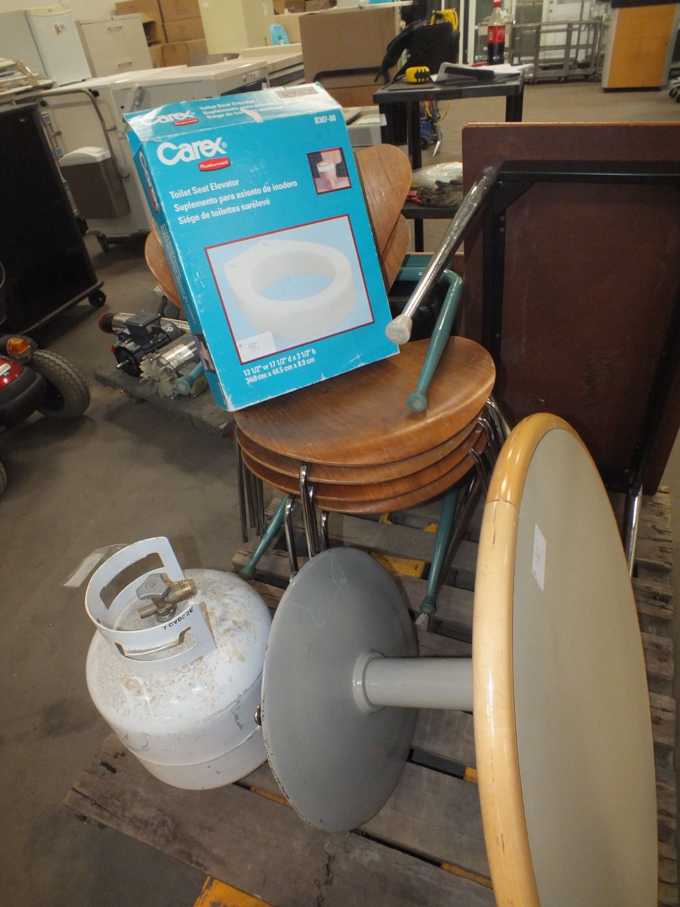 you get it all for one money, 2 small desks, 1 small table, propane tank, 4 stacking chairs, 1 toilet seat elevator...used
