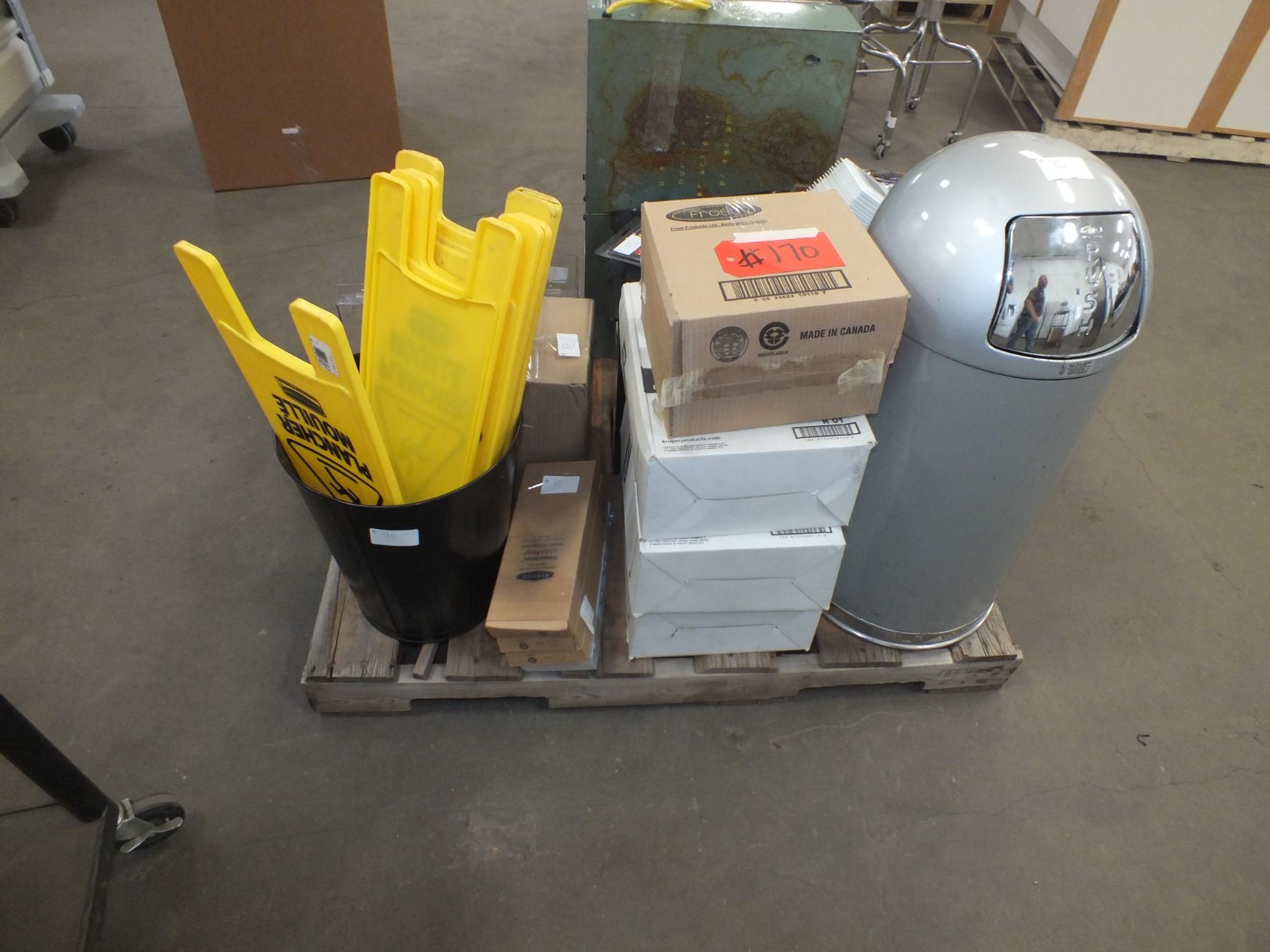 you get it all for one money, wet floor signs, trash cans, plastic coffee cups, x-ray light, ballast, eye wash holders, assorted kitch utensils, dispensers, ...used