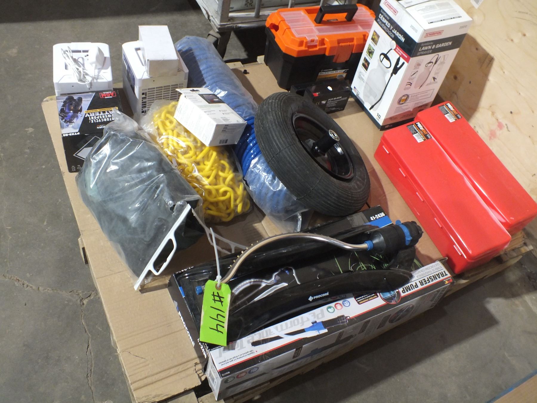 you get tool box, roadside triangles, sprayer, air hose, sprinklers, plastic chain, and a small tire...store returns...sold as is / where is...used