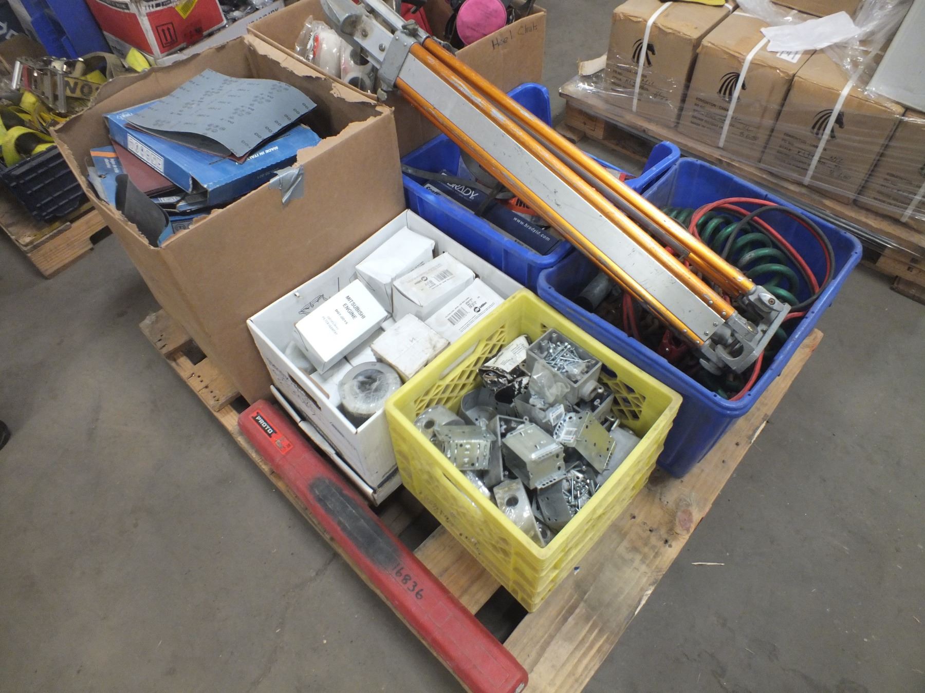 you get electrical Boxes, booster cables, laser level tripod, sand paper, painting supplies, diesel fuel filters, chain, rope, oxy acetylene gauges, liquid gauges, face shield, foil tape...sold as is / where is...used