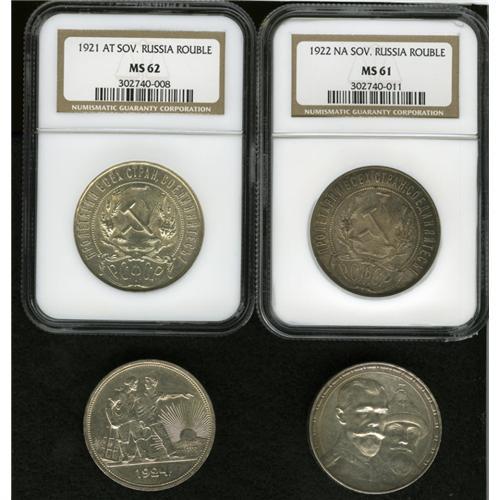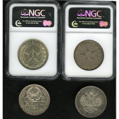 <B>Mixed Rouble lot as follows:</B></I> 300th Anniversary Romanov Dynasty 1913-, KM-Y70, XF/AU with reverse rim bump; 1921 R.S.F.S.R., KM-Y84, MS62 NGC; 1922-, KM-Y84, MS61 NGC; and a 1924, KM-Y90.1, AU.<BR><I>From the St. Petersburg Collection.</B></I>