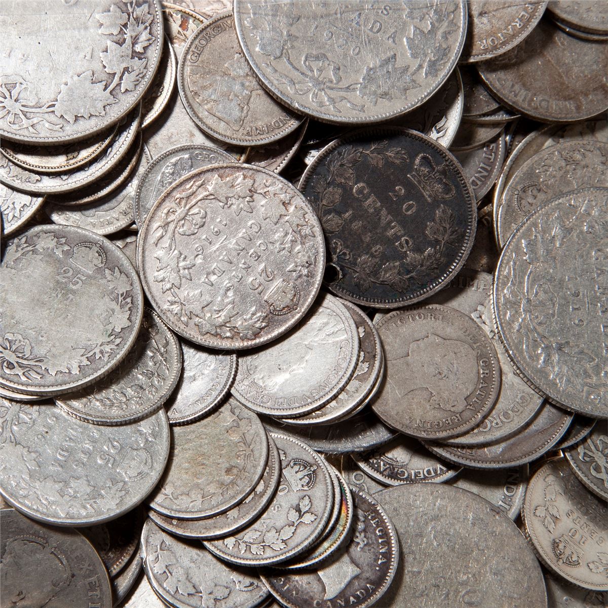 Mixed Silver Lot. Canadian and NFLD. Canadian coins are mostly pre-1920, with many Victorian coins. NL coins to the 1940's. Also includes one (1) 1927 25 cent. Weight 4 kg, approx. 110-120 troy ounces ASW. Viewing highly recommended. Sold as-is, no returns.