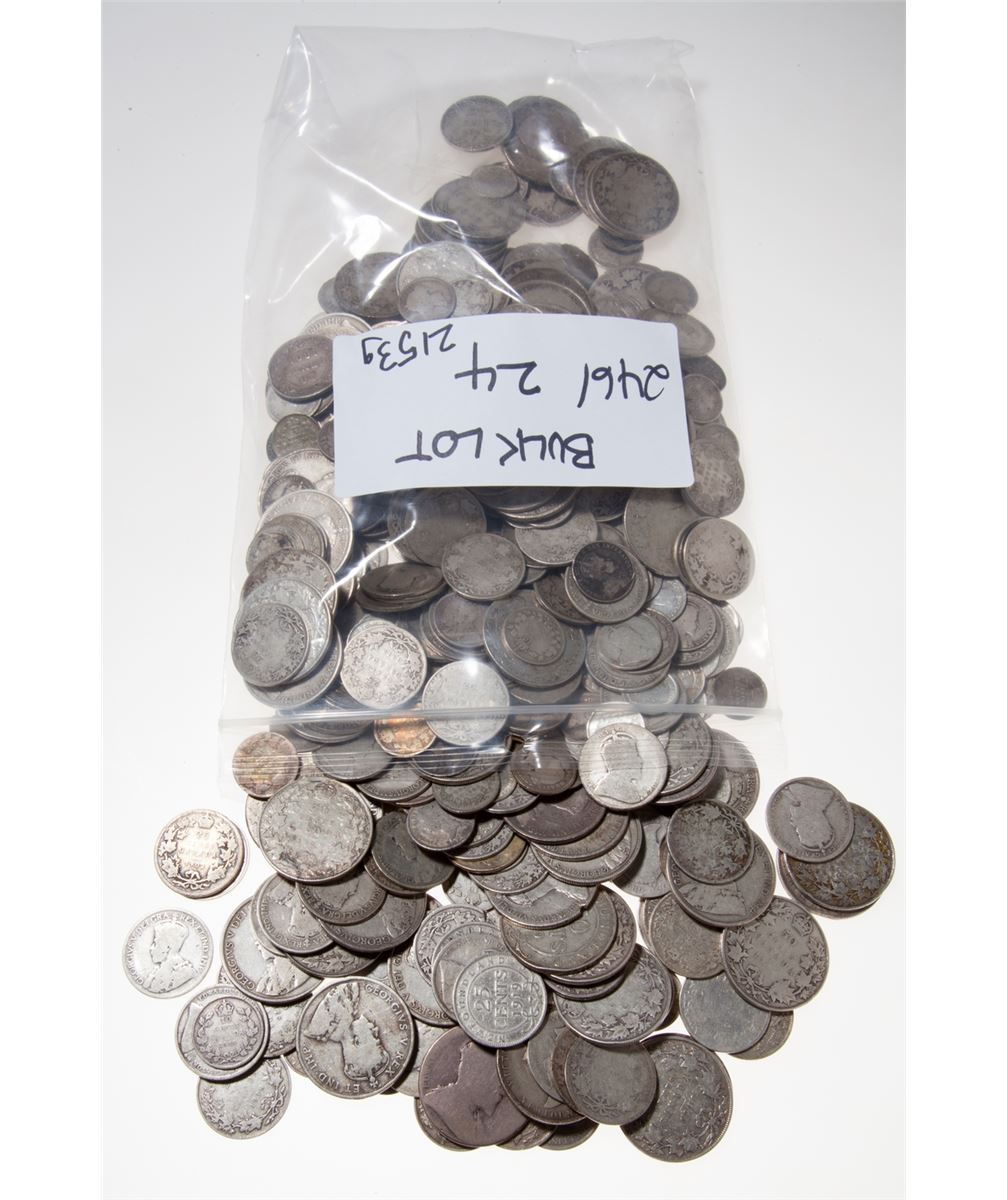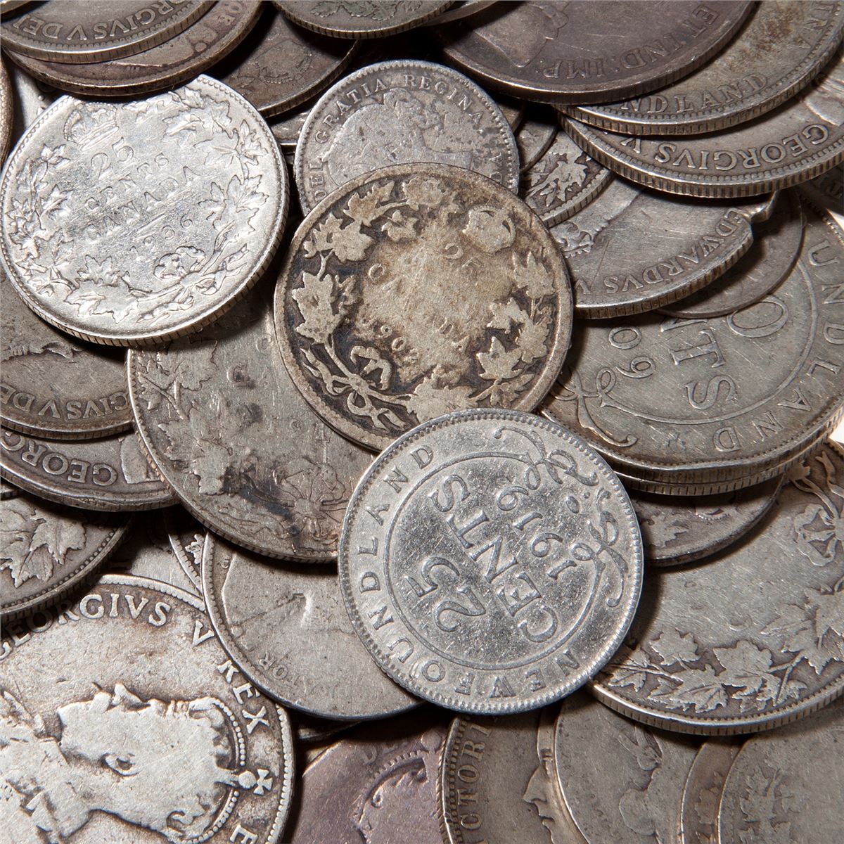 Mixed Silver Lot. Canadian and NFLD. Includes Canadian 50 cents, 25 cents, 10 cents and 5 cents of Queen Victoria, King Edward VII and King George V, as well as a variety of Newfoundland silver coinage from Queen Victoria, King Edward VII, King George V and King George VI. Most are modest condition with occassional imperfections, but they are generally problem-free, with many nicer coins for the dealer or silver bug. 2.15 kg gross weight. Viewing highly recommended. Sold as-is, no returns.