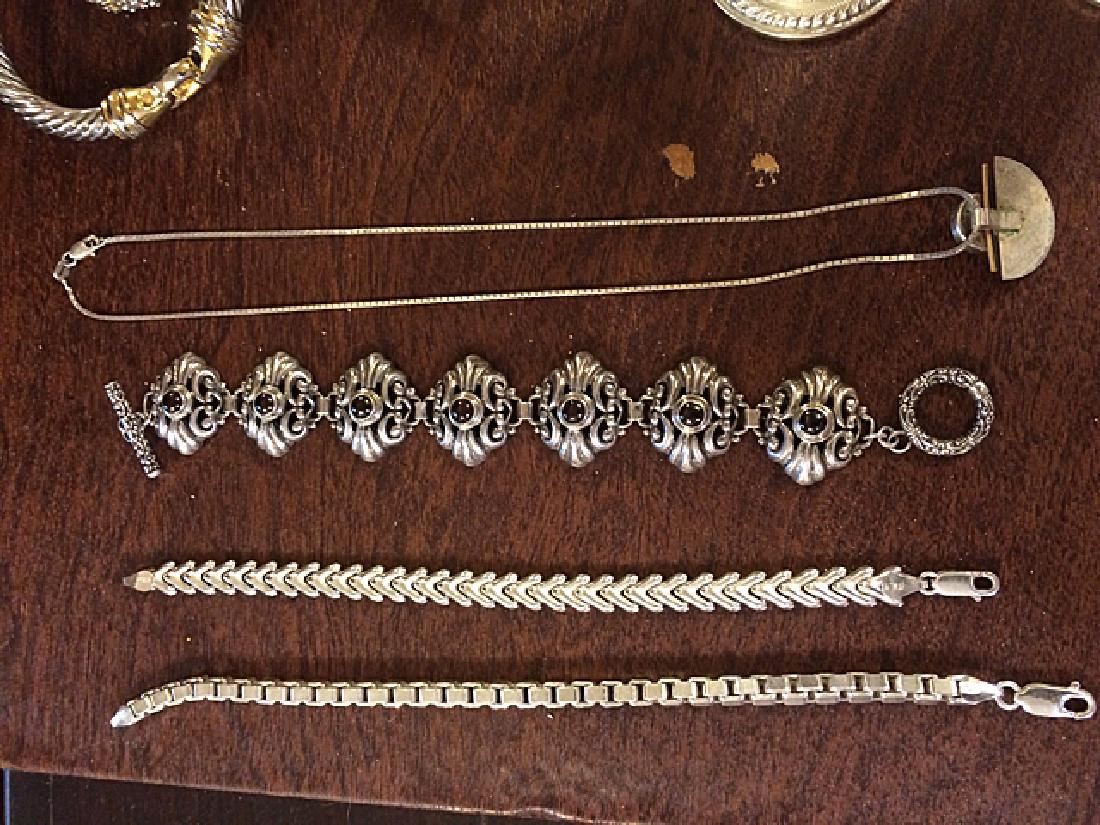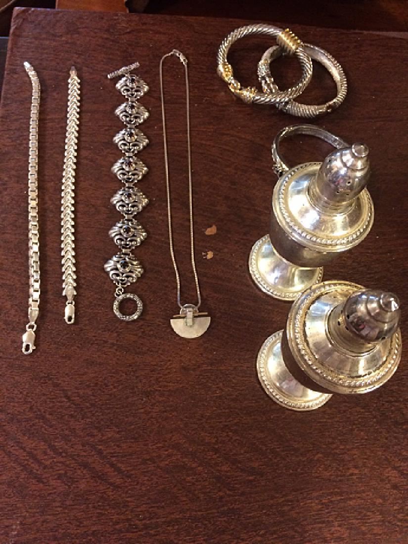 Sterling silver salt and pepper shakers, sterling bracelets, and including sterling bracelets and other estate jewelry