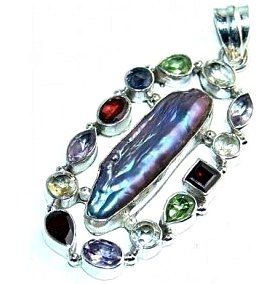Silver and Mixed Stones & Biwa Pearl Pendant. Items are hand made as ordered so please allow 6 to 8 weeks for delivery.