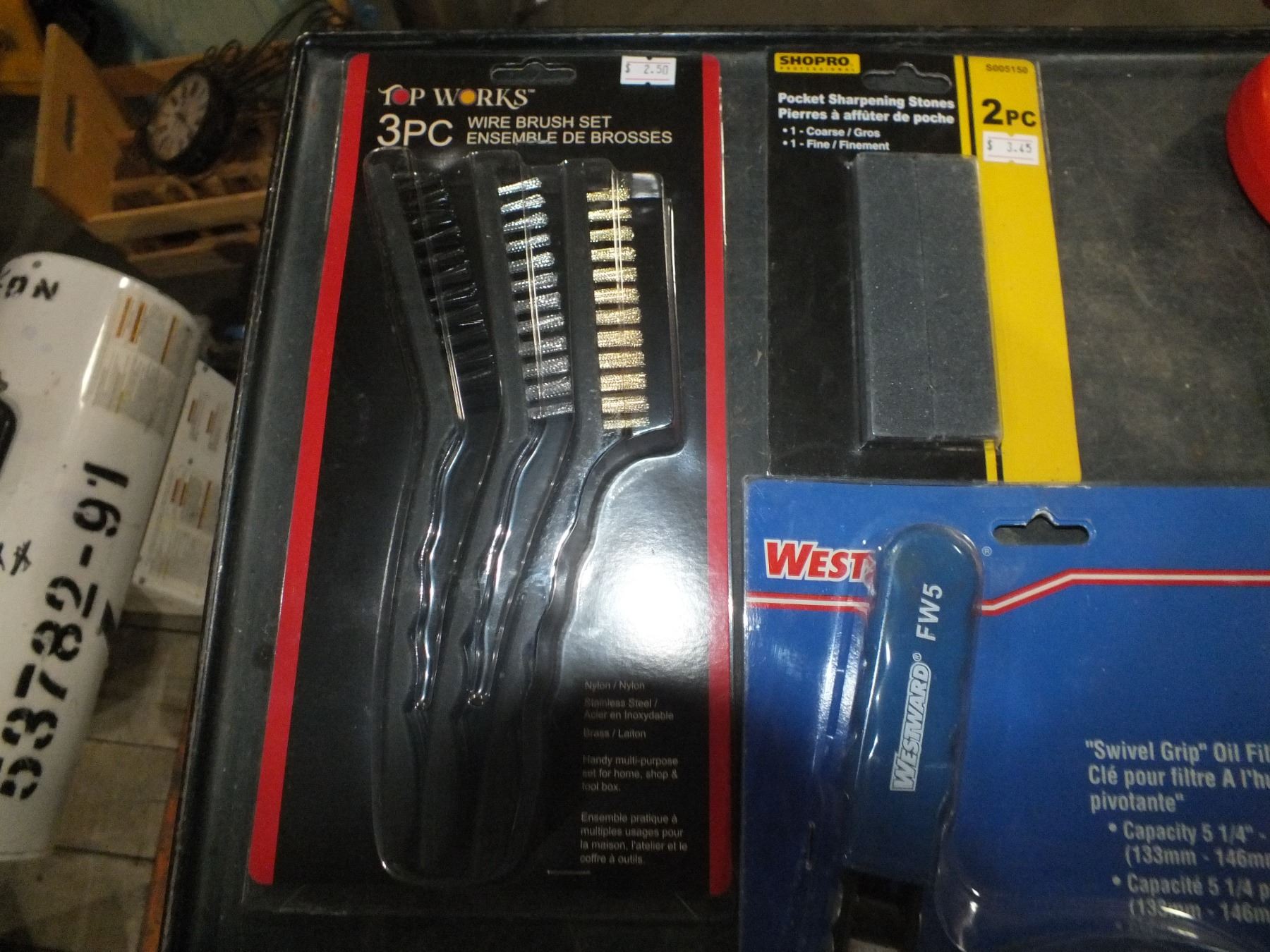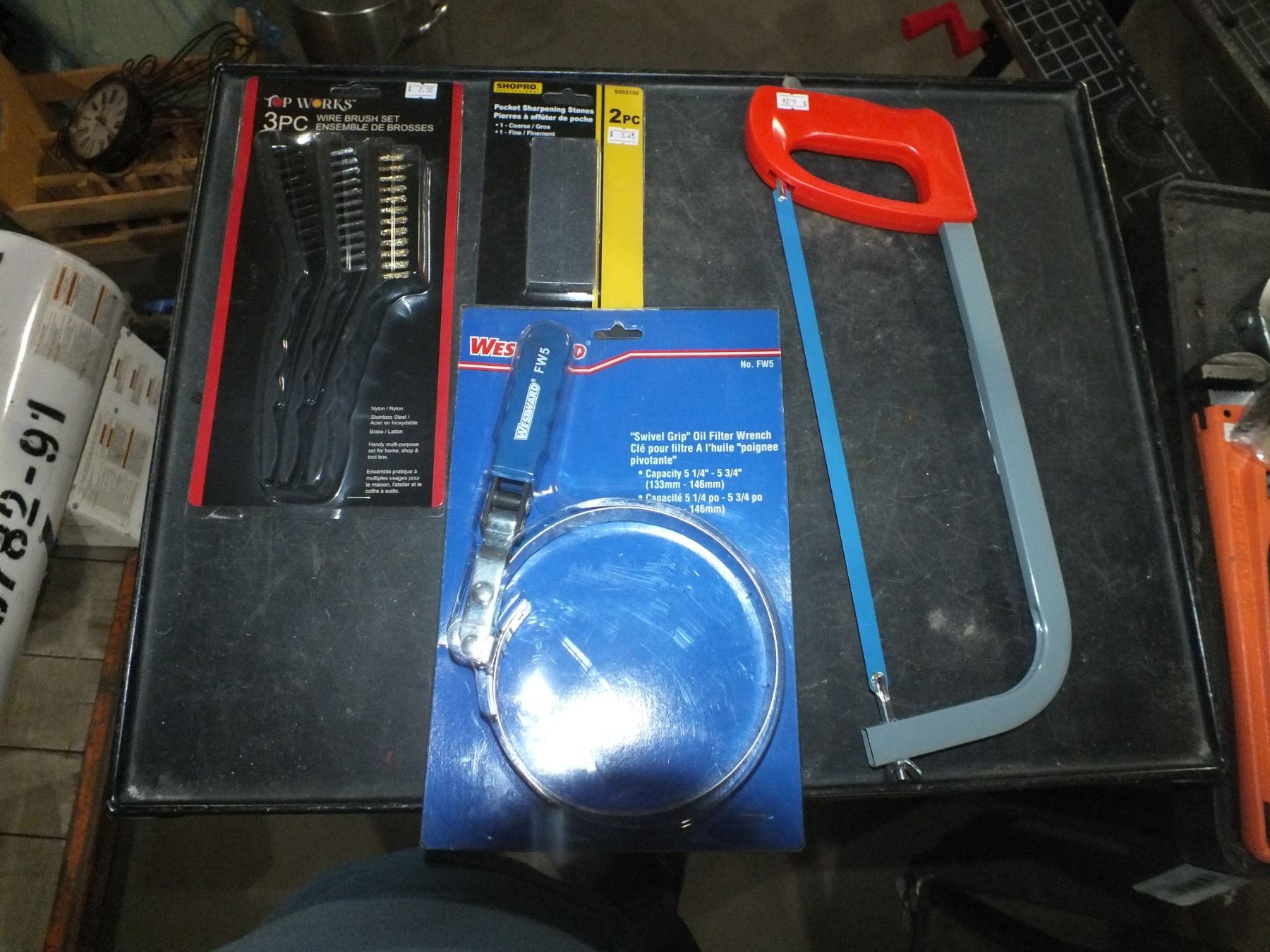 you get it all for one money, swivel grip oil filter wrench, hack saw, 3pc wire brush set and a 2pc pocket sharping stone...new