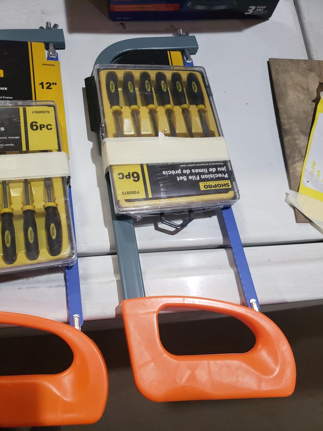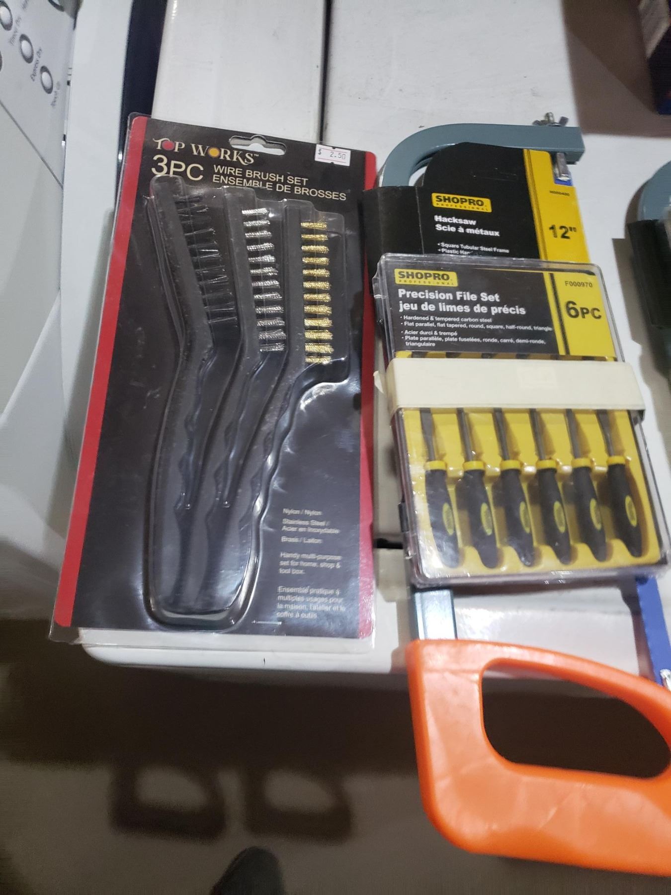 you get it all for one money, oil filter wrench, pocket sharpening stones, 3pc wire brush set, 3 hack saws and 2 6pc file sets...all new