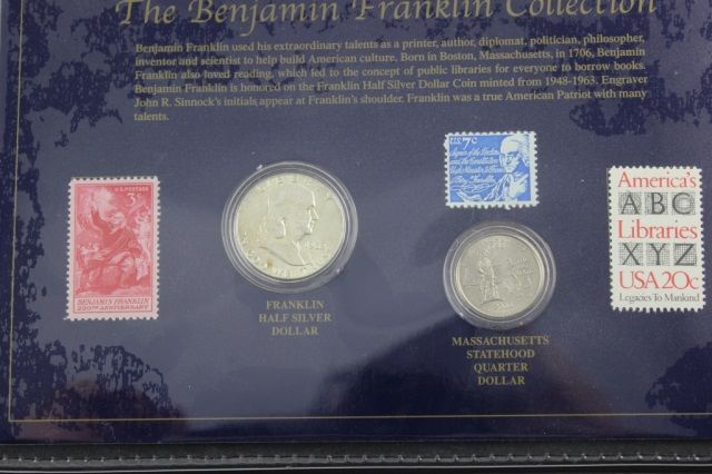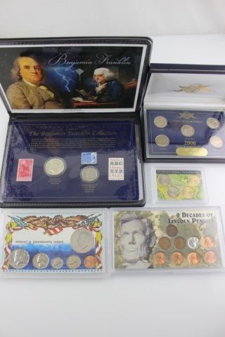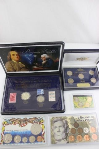 This wonderful lot is a mixed collection of US coin in Collectors Packaging. Included in this lot are four Westward Journey Nickels, Eisenhower Series Coin Collection (6 coins), 9 decades of Lincoln Pennies, 2006 Denver Min State Quarter Collection, and The Benjamin Franklin Collection featuring a 1962 90% Silver Franklin Half Dollar.