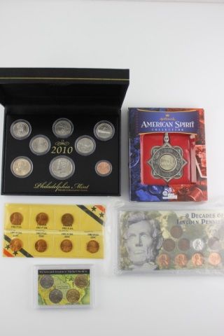 This is a mixed collection of US coins. Included in this collection are four Westward Journey Nickels in collectors packaging, 1982 US Penny collection (7), 9 decades of Lincoln Pennies in collectors packaging, 2010 Philadelphia Mint Coin collection in collectors packaging,and a American Spirit Collection Quarter by Hallmark.