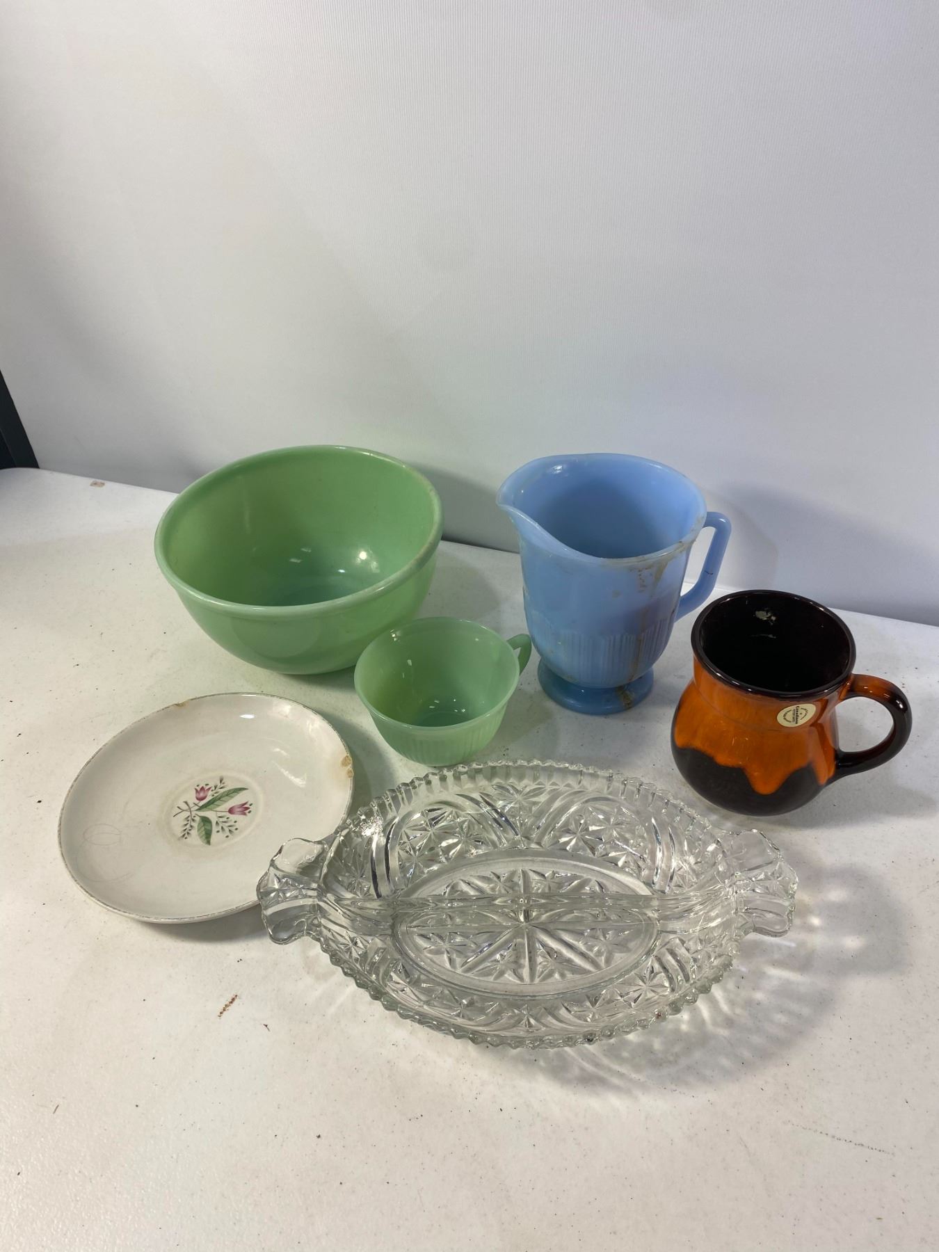 Assorted vintage kitchen pieces including glass relish tray, ceramic plate, Fire-King style bowls, mug, and pitcher. Approx. mid 20th century. Condition: some chips and wear.