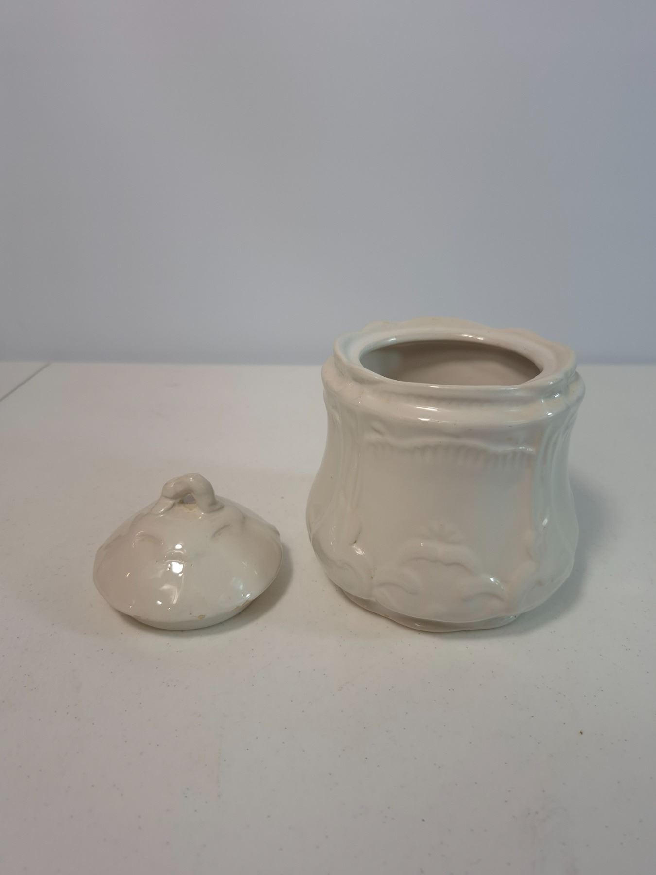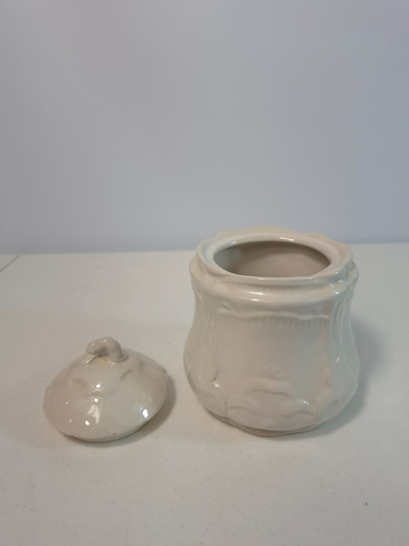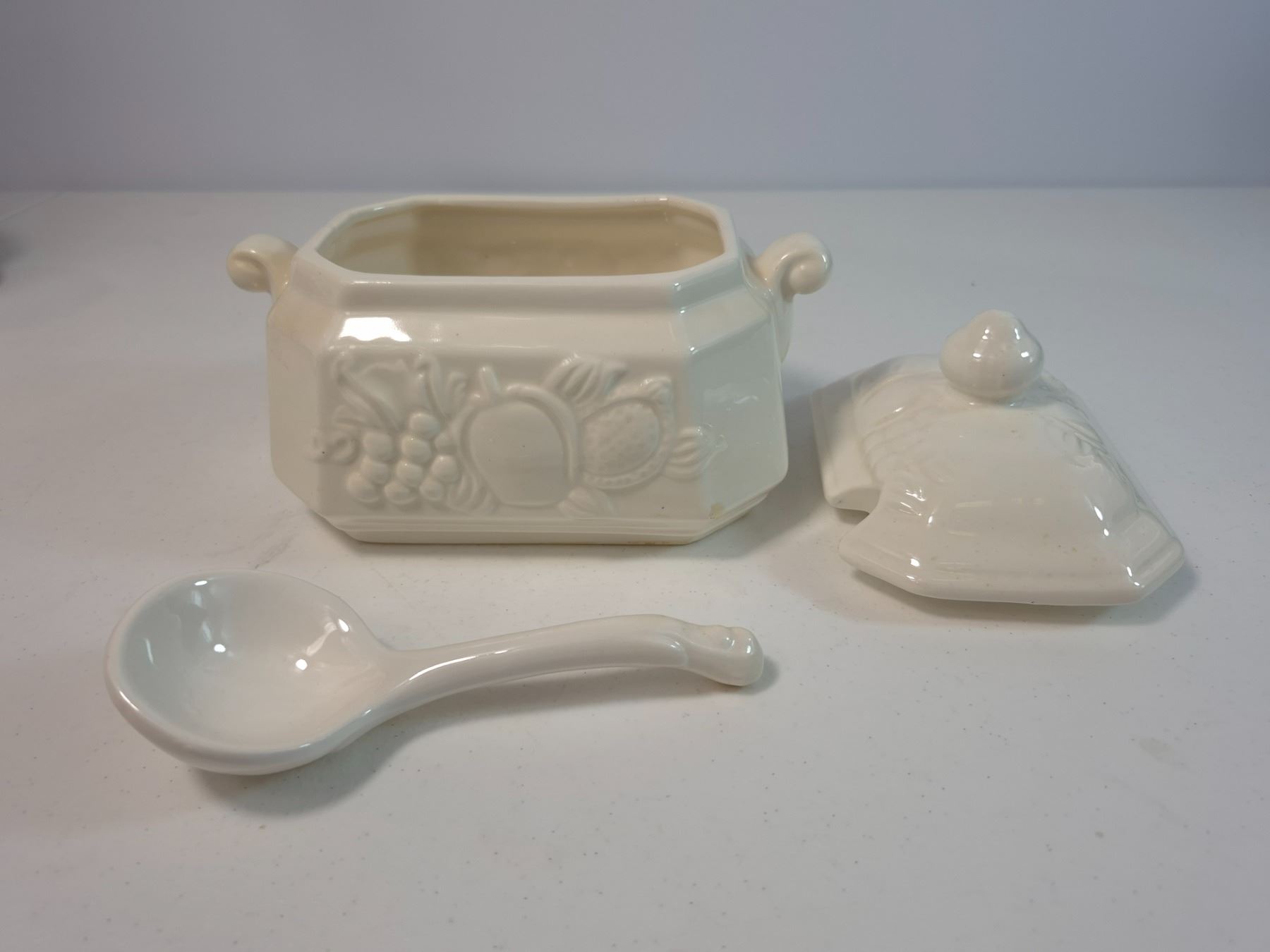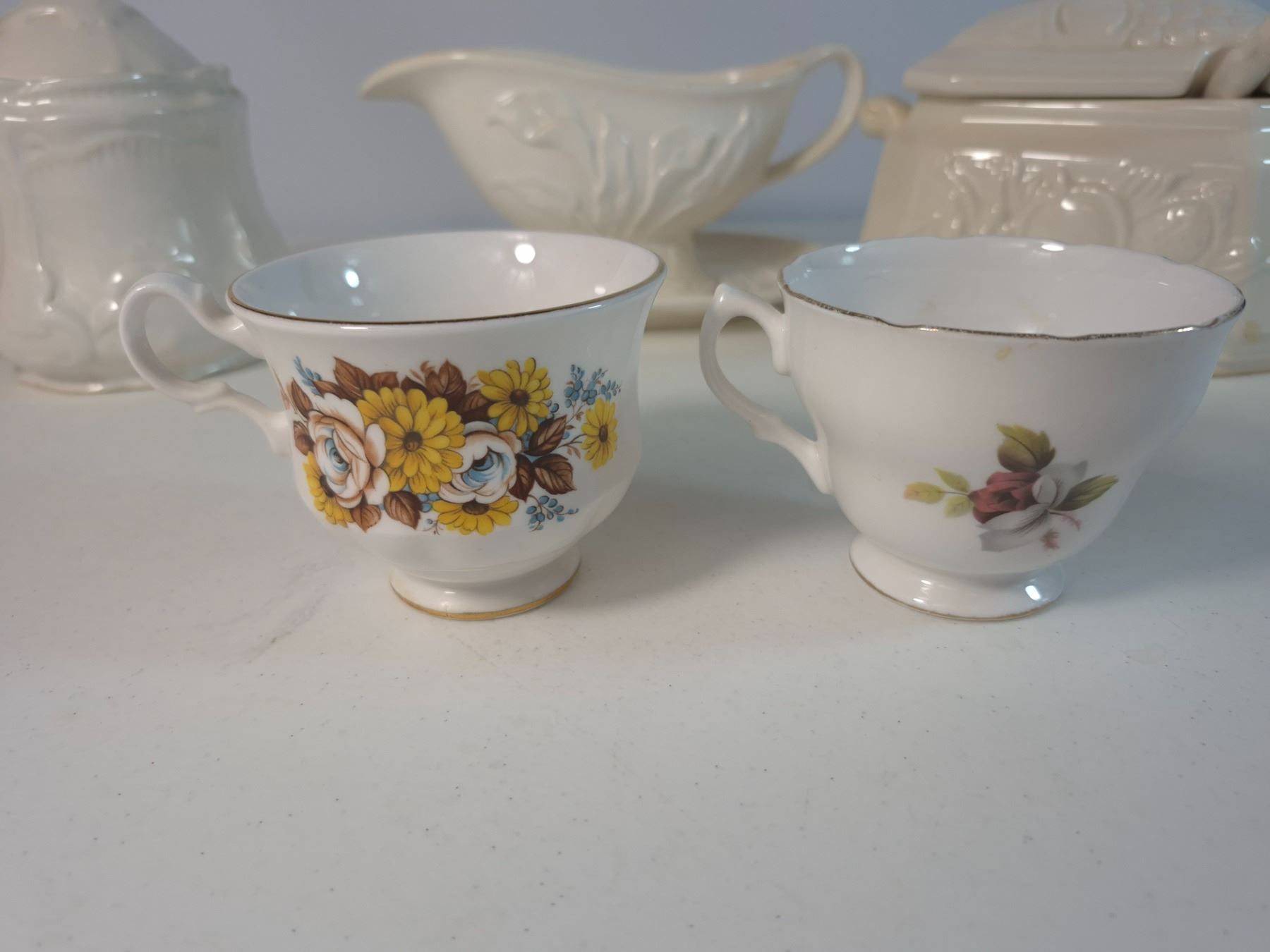 Includes gravy boat, covered sugar dish, small creamer, and two floral teacups. Early to mid-20th century, light wear consistent with age.