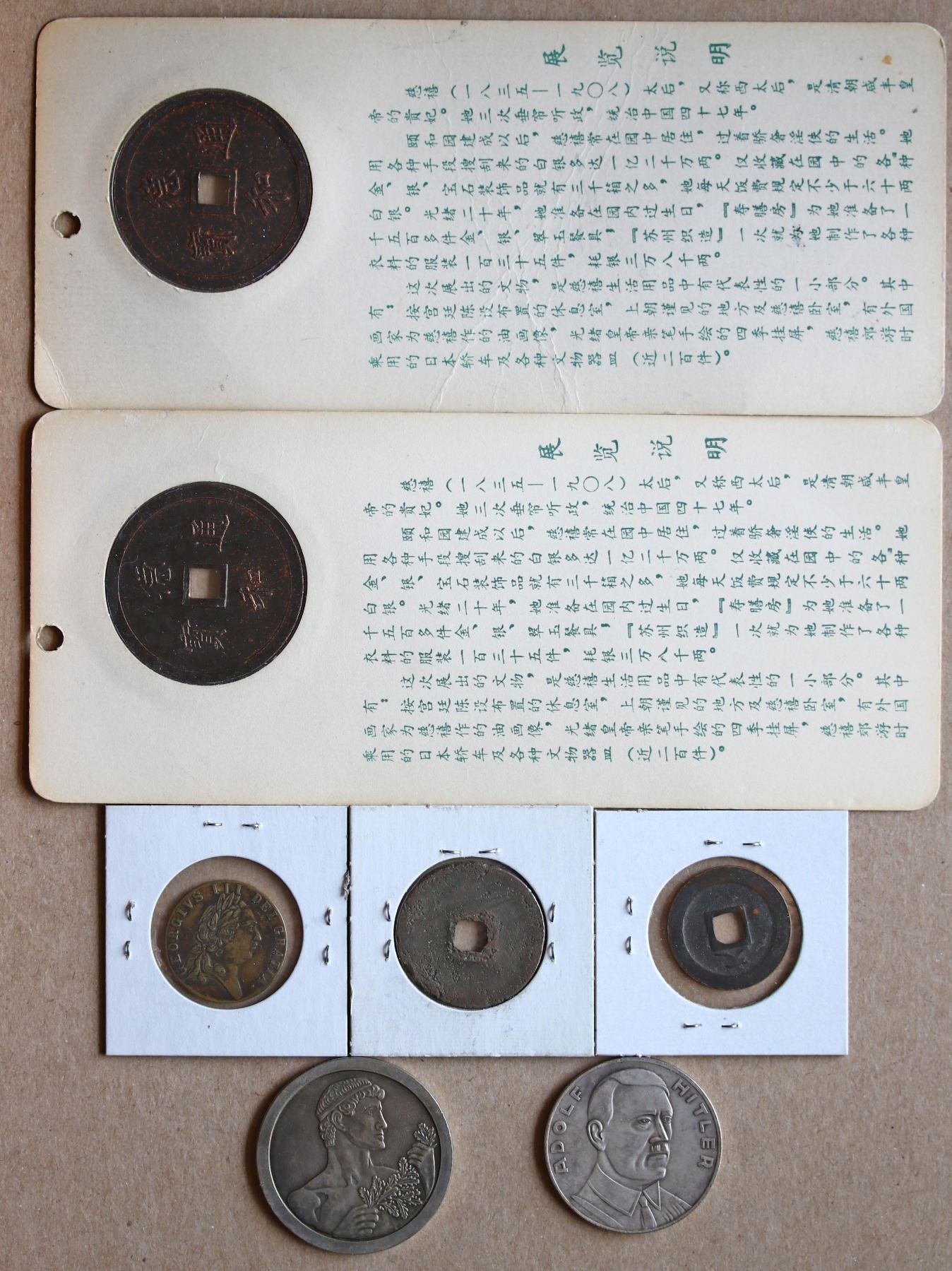 Mixed World coins & medals. Includes China, Germany, GB. Lot of 7 coins. Should be viewed carefully. Some very interesting pieces. Grades vary.