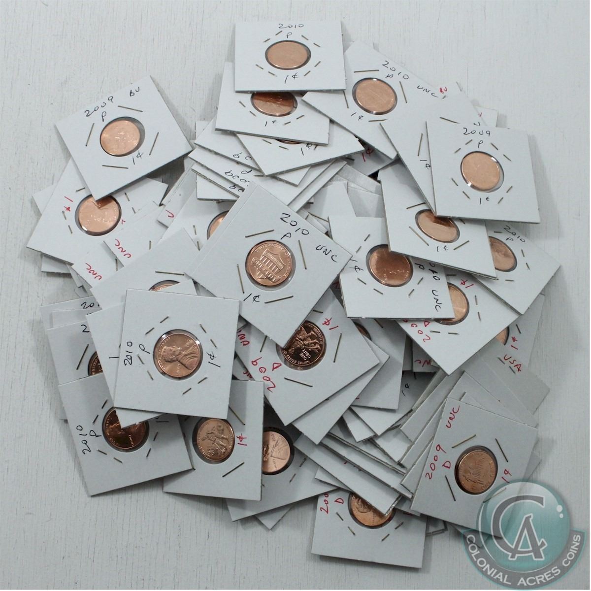 Mixed bag of 94X United States 1-cent Coins. You will receive 40x 2009-D Type 2- Formitive Years, 1x 2009-D Type 3 Professional life, 9x 2009P Type 2-formitive years, 35x 2010-P Shield, and 9x 2010D Shield (94 coins total)