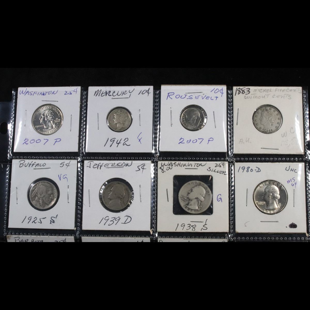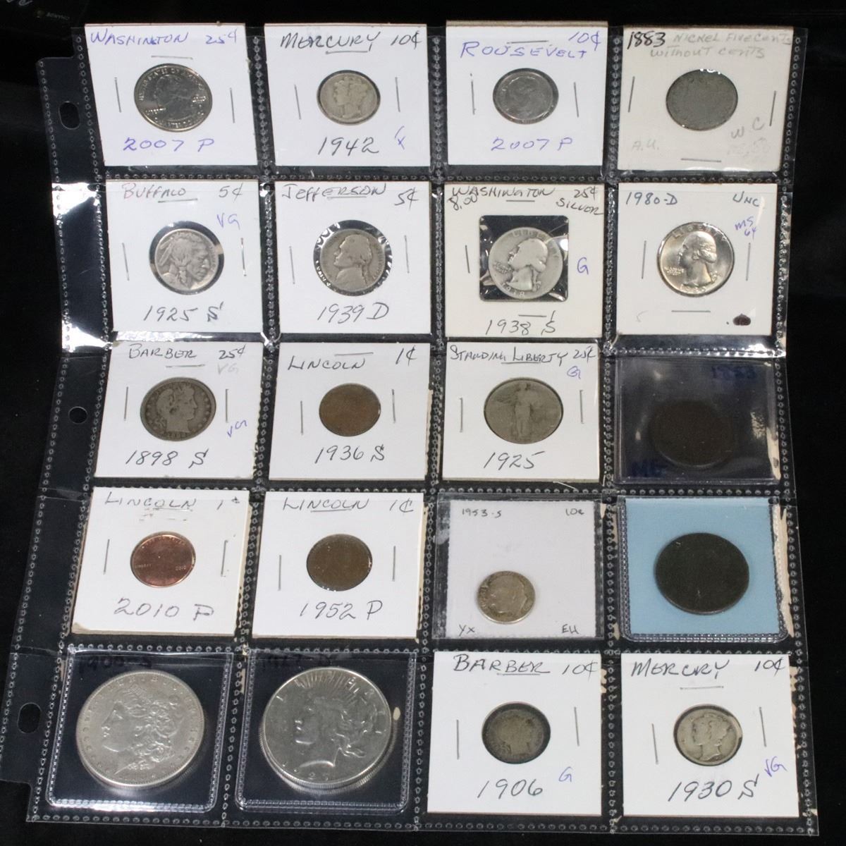 Mixed coins Morgan $1, Peace $1, Standing Liberty 25c, Barber 10c, Braided Hair 1c, Buffalo 5c . .. A nice page of a wide variety of 20 coins. This page includes 1900-s Morgan, 1927-d Peace Dollar, 1906 Barber Dime, 1930-s Mercury Dime, 2010-p Lincoln Cent, 1952-p Lincoln Cent, 1953-s Roosevelt Dime. 1818 Coronet Head Cent, 1898-s Barber Dime, 1936-s Lincoln Cent, 1925 Standing Liberty Quarter, 1853 Braided Hair Cent, 1925-s Buffalo Nickel, 1939-d Jefferson Nickel, 1938-s Washington Quarter, 1980-d Washington Quarter,2007-p Washington Quarter, 1942-p Mercury Dime, 2007-p Roosevelt Dime, and a 1883 Without Cent Liberty Nickel.