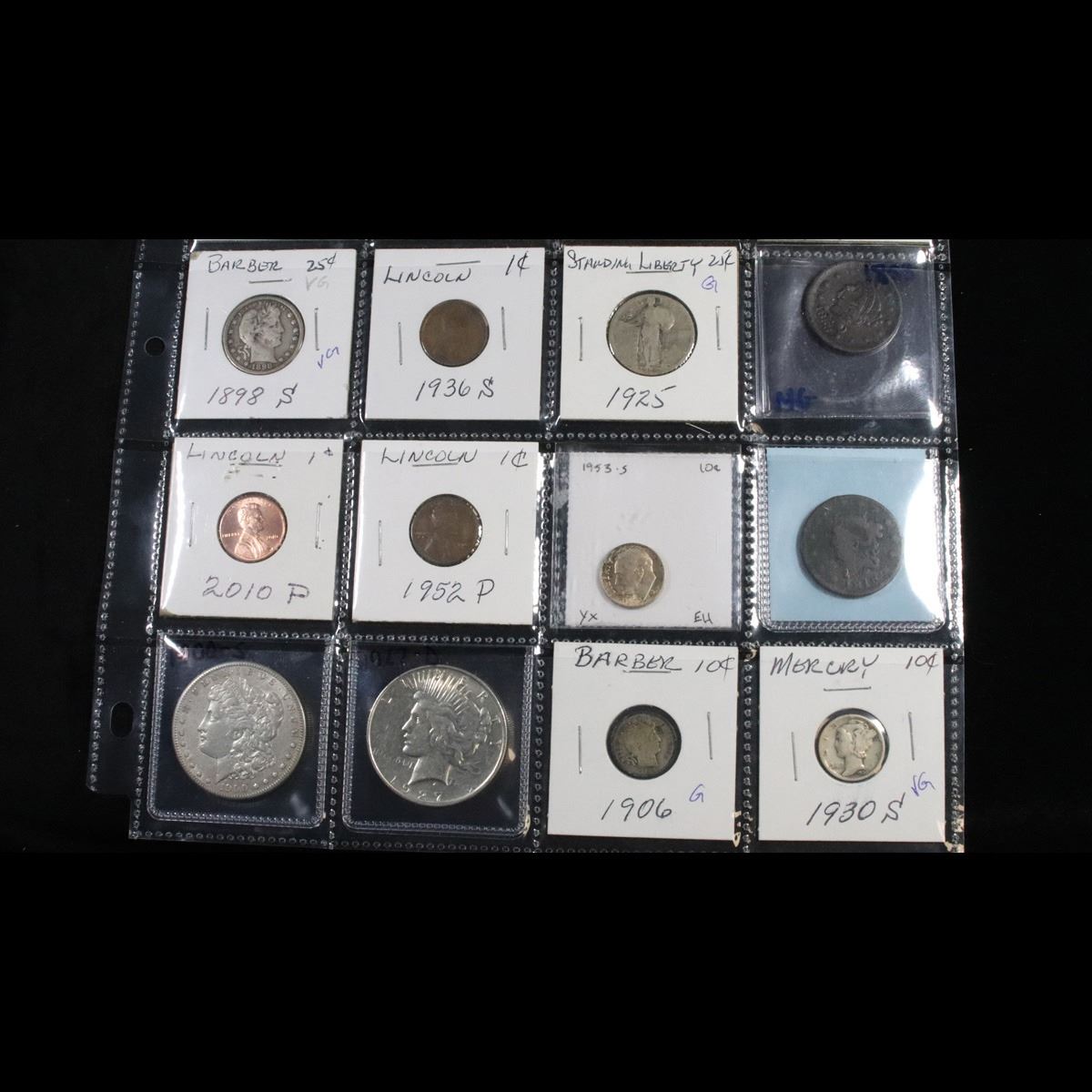 Mixed coins Morgan $1, Peace $1, Standing Liberty 25c, Barber 10c, Braided Hair 1c, Buffalo 5c