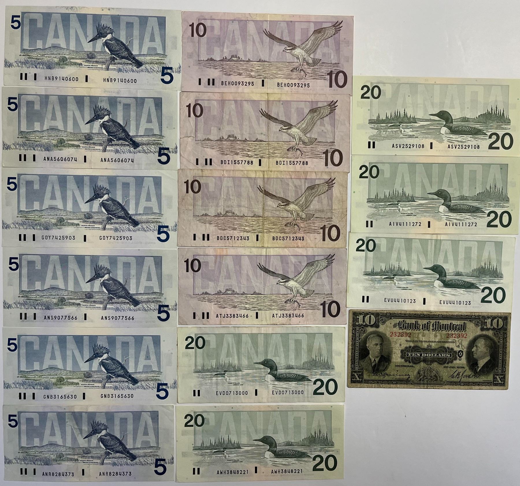 Mixed lot; Bank of Montreal 1938 $10, Birds series, various denominations, signatures and grades. VG to AU.