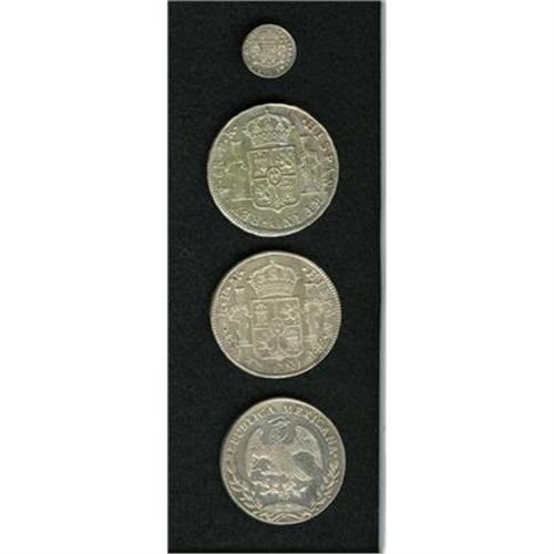 <B>Mixed lot as follows:</B></I> 1/2 Real 1821 Mo-JJ, Choice AU; 8 Reales 1792 Mo-FM, cleaned XF with light obverse scratches; 8 Reales 1843 Mo-MM, AU with light hairlines; and a Bolivia 8 Reales 1776 PTS-PR, cleaned XF with small obverse flan flaws. <B>A sold as is, no return lot.</B></I> <B>A sold as is, no return lot.</B></I>