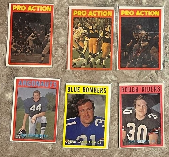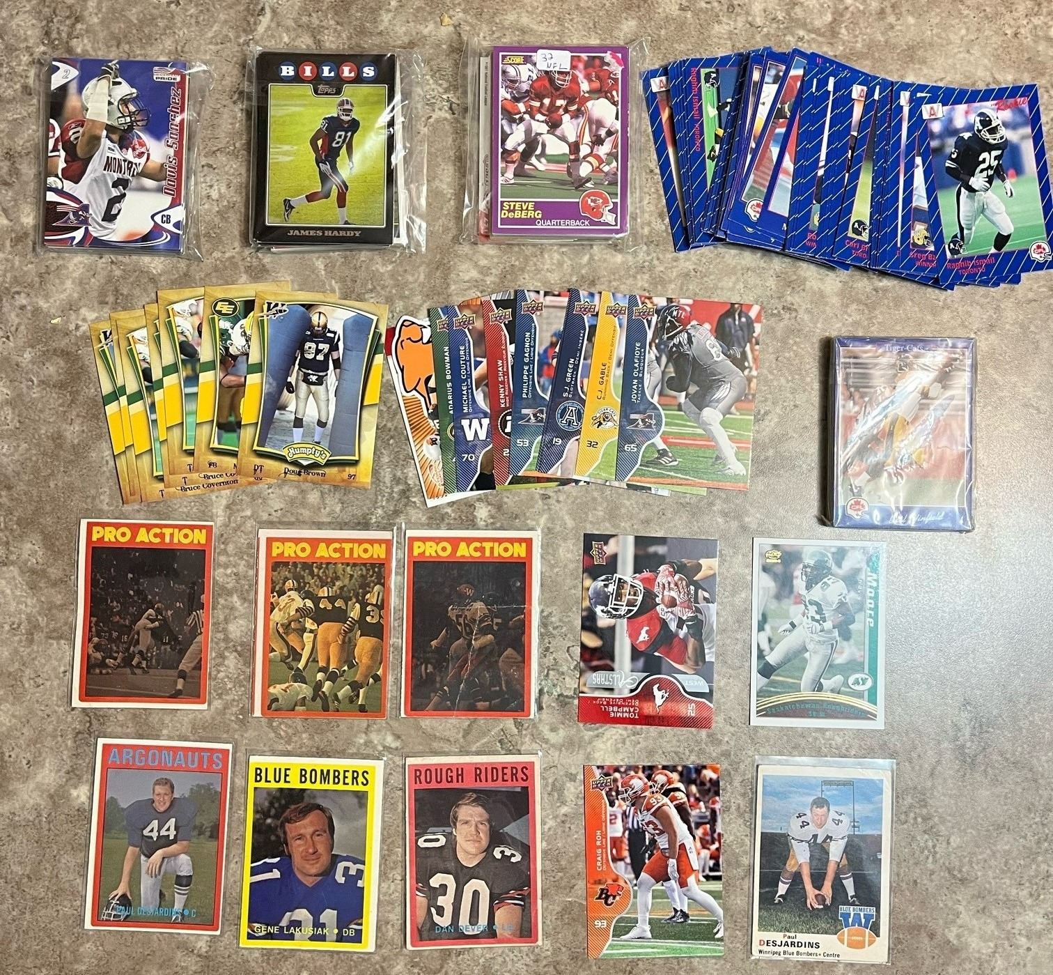 Mixed lot box of 190 CFL & NFL Football cards from 1970 – 2017. Upper Deck, OPC, Topps, Score, W, JOGO, Extreme Sports. Interesting mix!