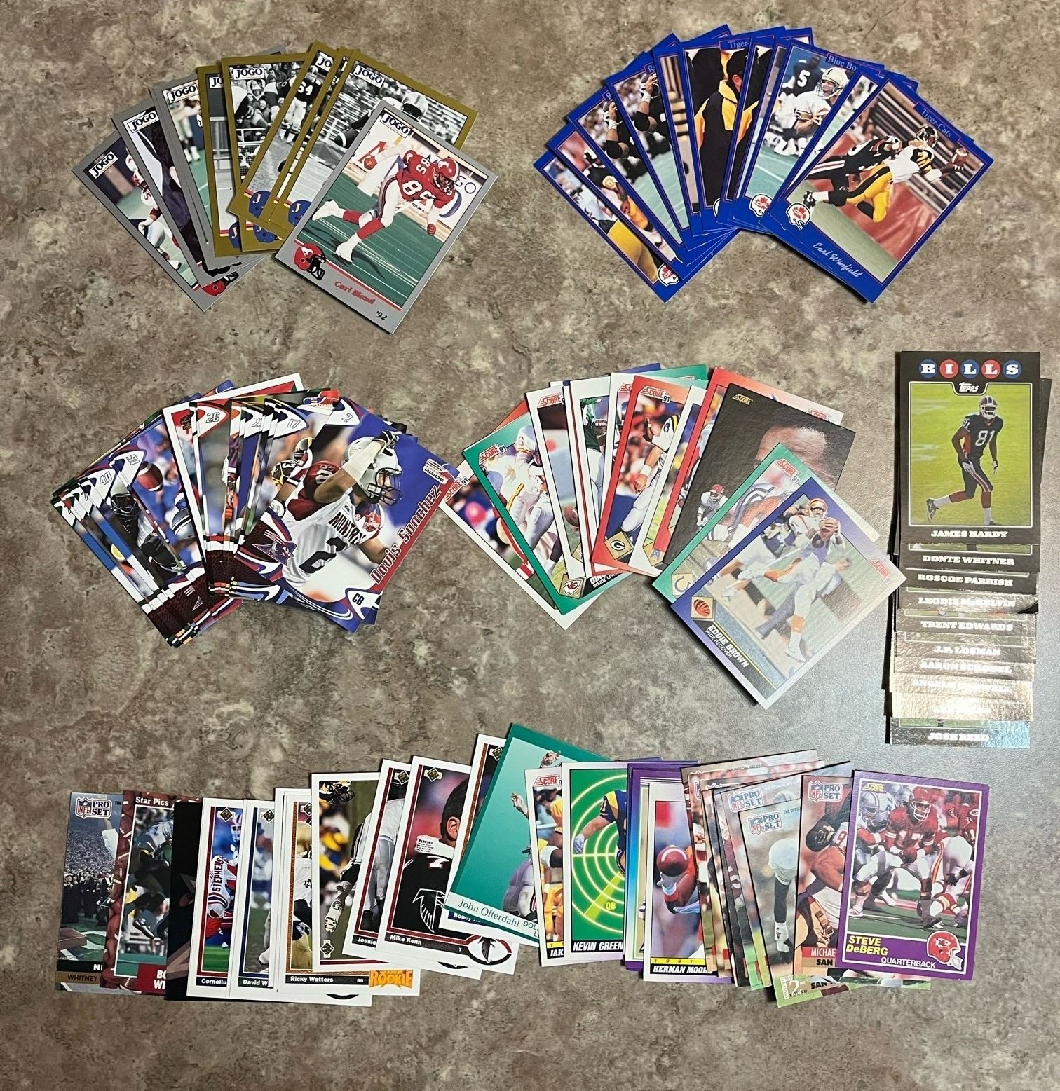 Mixed lot box of 190 CFL & NFL Football cards from 1970 – 2017. Upper Deck, OPC, Topps, Score, W, JO