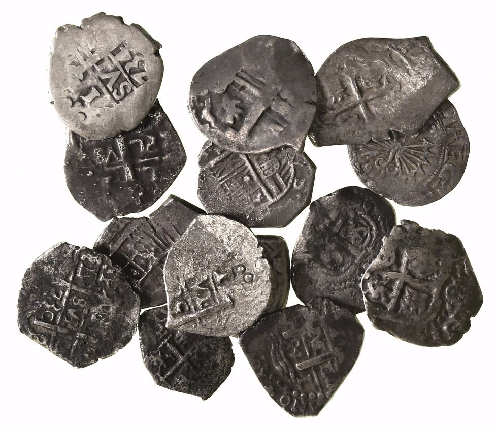 Mixed lot of 14 cob 1R (13) and 1/2R (1), mints of Mexico, Lima, Potosi and Spain, 1500s to 1700s. 36.31 grams total. A sundry group of types and periods (from Ferdinand-Isabel to Philip V), a few salvaged but no holes, all toned, all with decent details (a few dated), Fine+ on average.