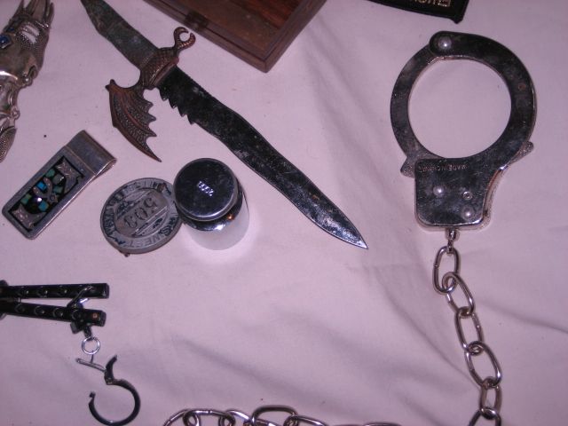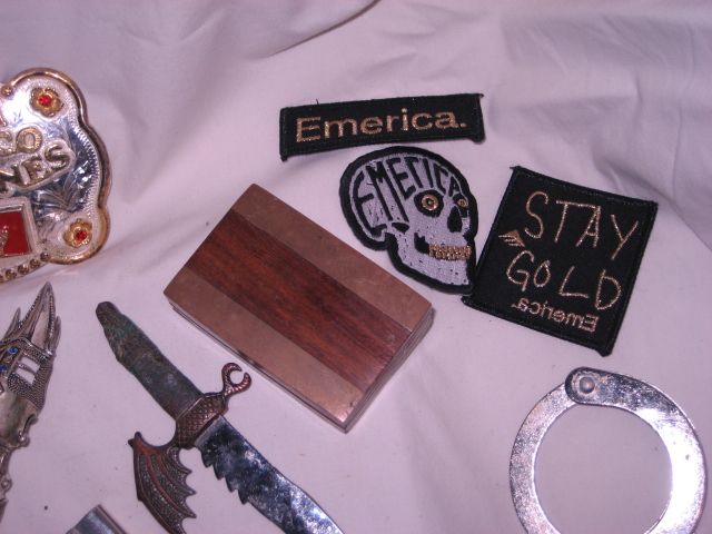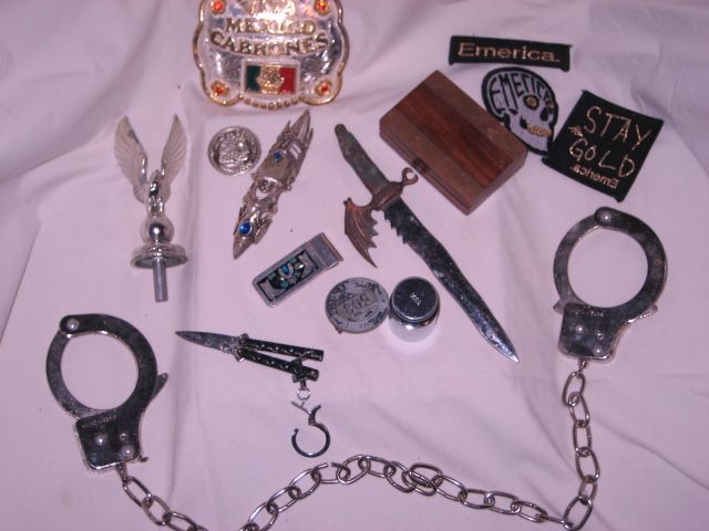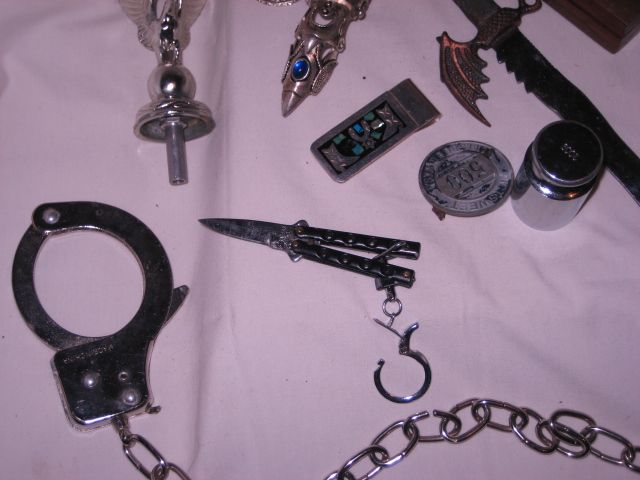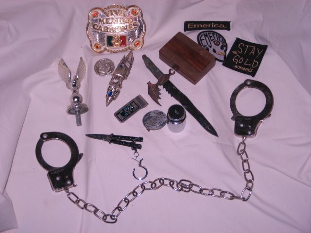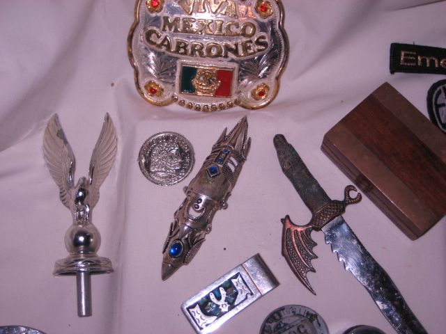 Hand Cuffs, Eagle Hood Ornament, 200 gram weight,Brass Inlayed mini Box, Mini Butterfly Knife, Mini Dragon Sword, Emerica Patches, Inlay Mexican Silver Money Clip, Large Mexican Belt Buckle