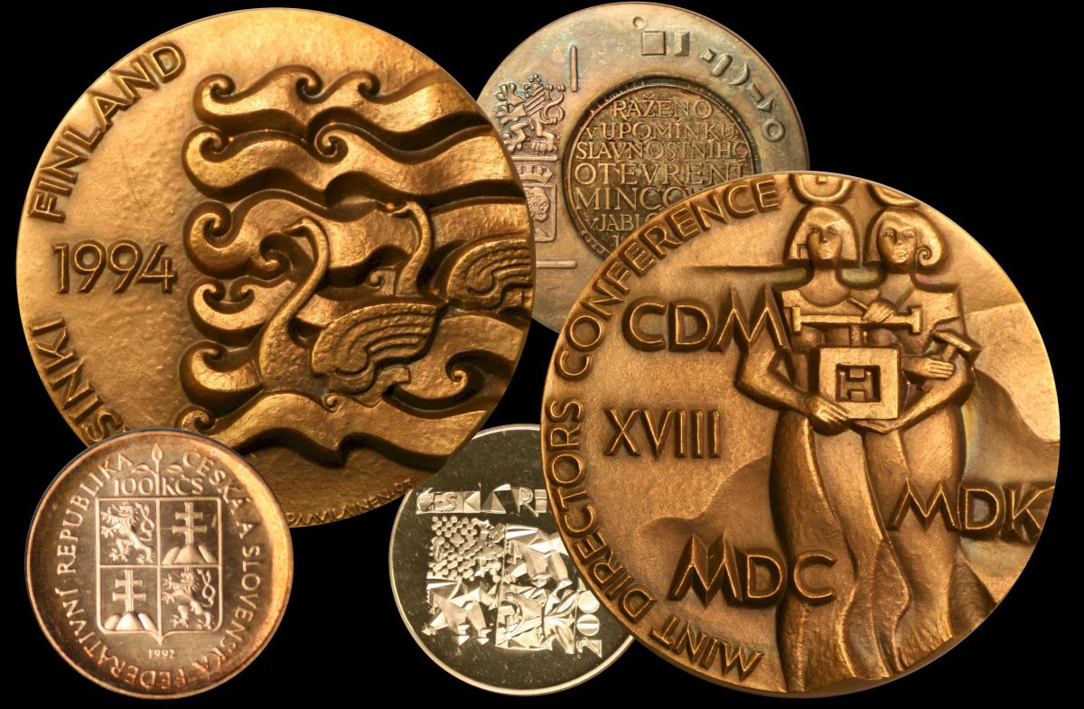 Mixed lot of World Mint products, includes Denmark1984 Mint Directors Conference medal. 40 mm bronze OBV design symbolizing minting of 5 Kroner coins. REV classical metal rope design and Finland 1994 Mint Directors Conference medal. Three of 60mm cast bronze medal of deep sculpted design, in presentation box and Mint sets Fin 1, 1989 – MS 31, Fin 2, 1990 – 4 coins “The first stage of renewal”, Fin 3, 1994 MS 48 – consists of 5 circulating coins and a mint token. Only 25,000 of this mint series were issued, Fin 4, 1994 MS 48 and Fin 5, 1991. KM #70. 100 Mark .925 silver Aland Commemorative B.U. and Czech Republic 1991 mint set, 1992 mint set, KM #156 50 Korun 0.500 silver proof OBV – CSFR shield REV – Steamship Bohemia, 1993 Korun commemorative coin, 31mmn .700 silver proof Modernistic design. 1992 100 Korun proof and 1993 Silver medal struck by Bizuterie Mint for Czech Republic. Silver proof.