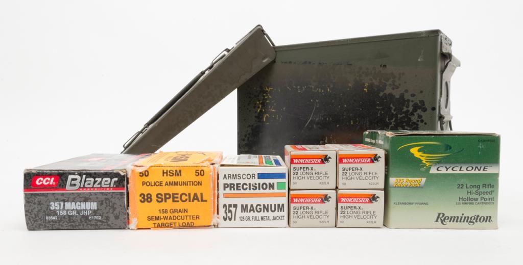 Mixed lot of ammunition including five boxes of .22 Long Rifle, totaling 525 rounds, two boxes of .357 Magnum totaling 94 rounds and a partial box of .38 Special. Est.: $150-$300.