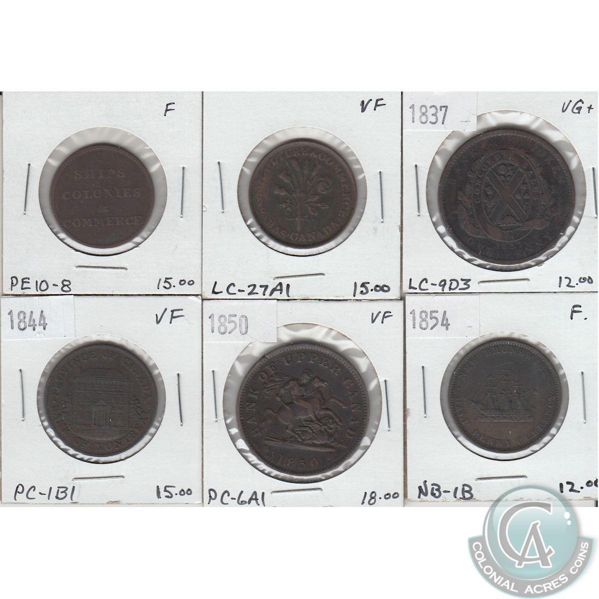 Mixed lot of bank tokens. Oldest date 1837. As per holders grades are VG to VF. 6pcs