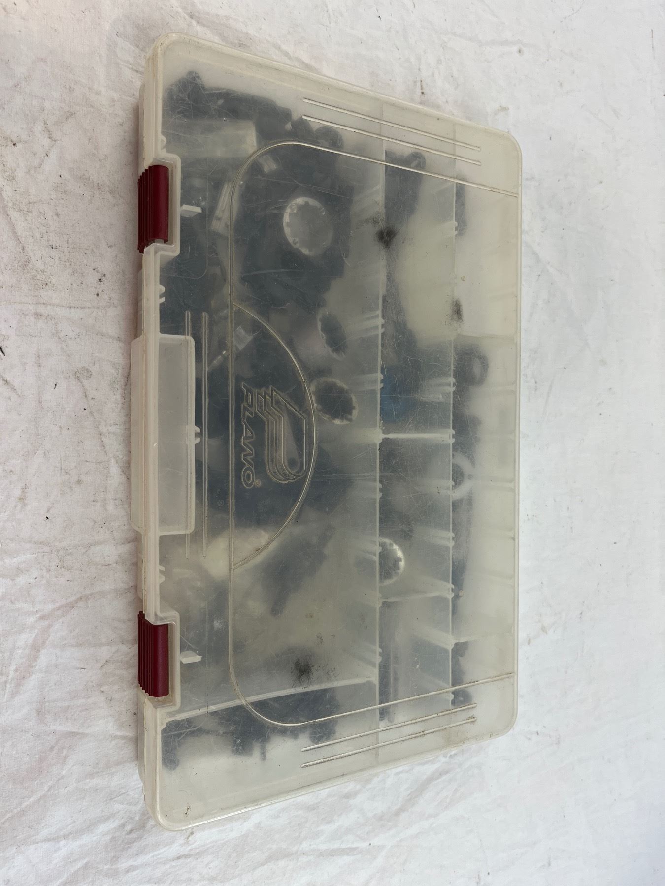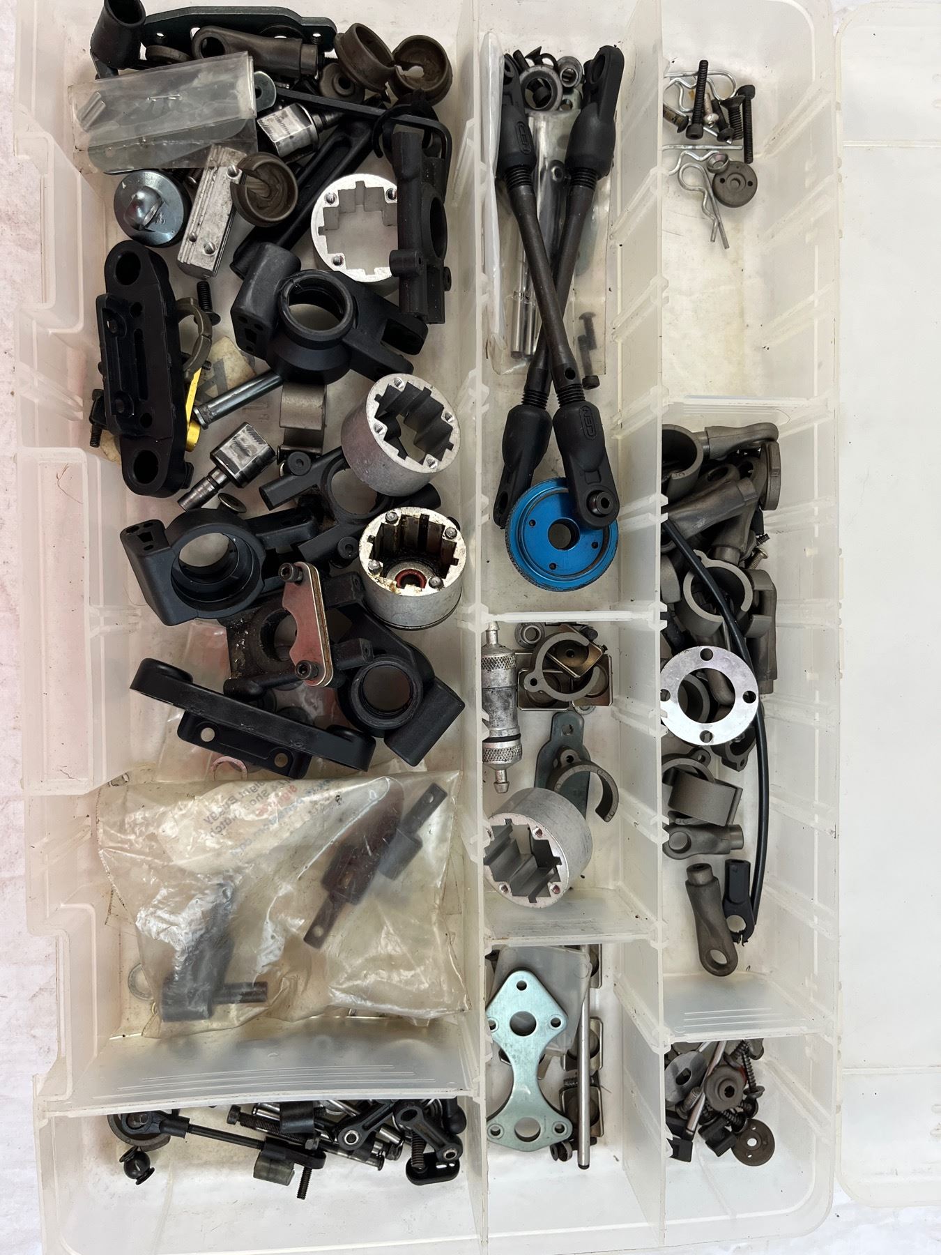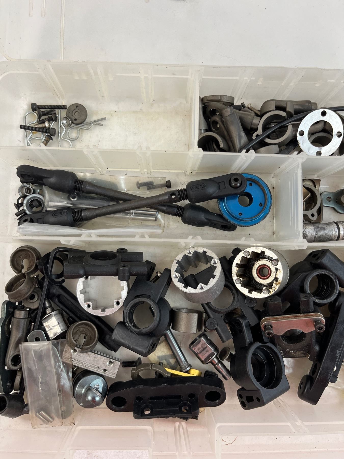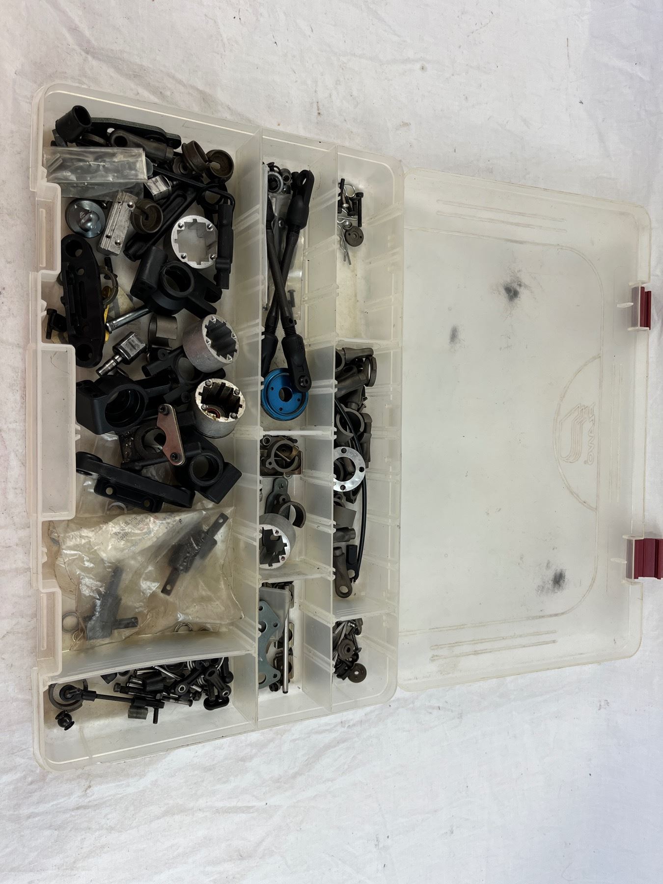 Components box with mixed parts in plastic and metal. Including berings bolts and other mixed parts.