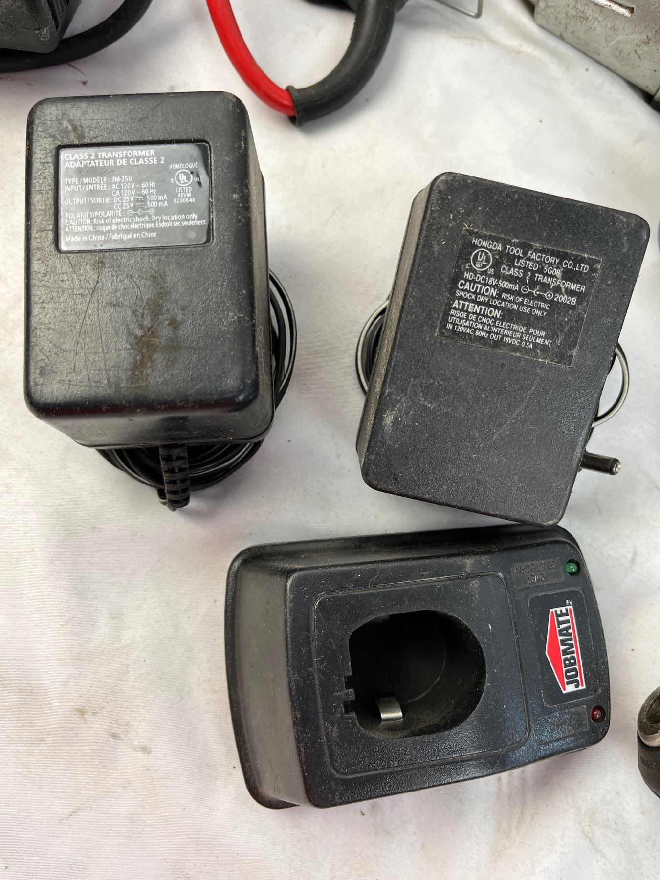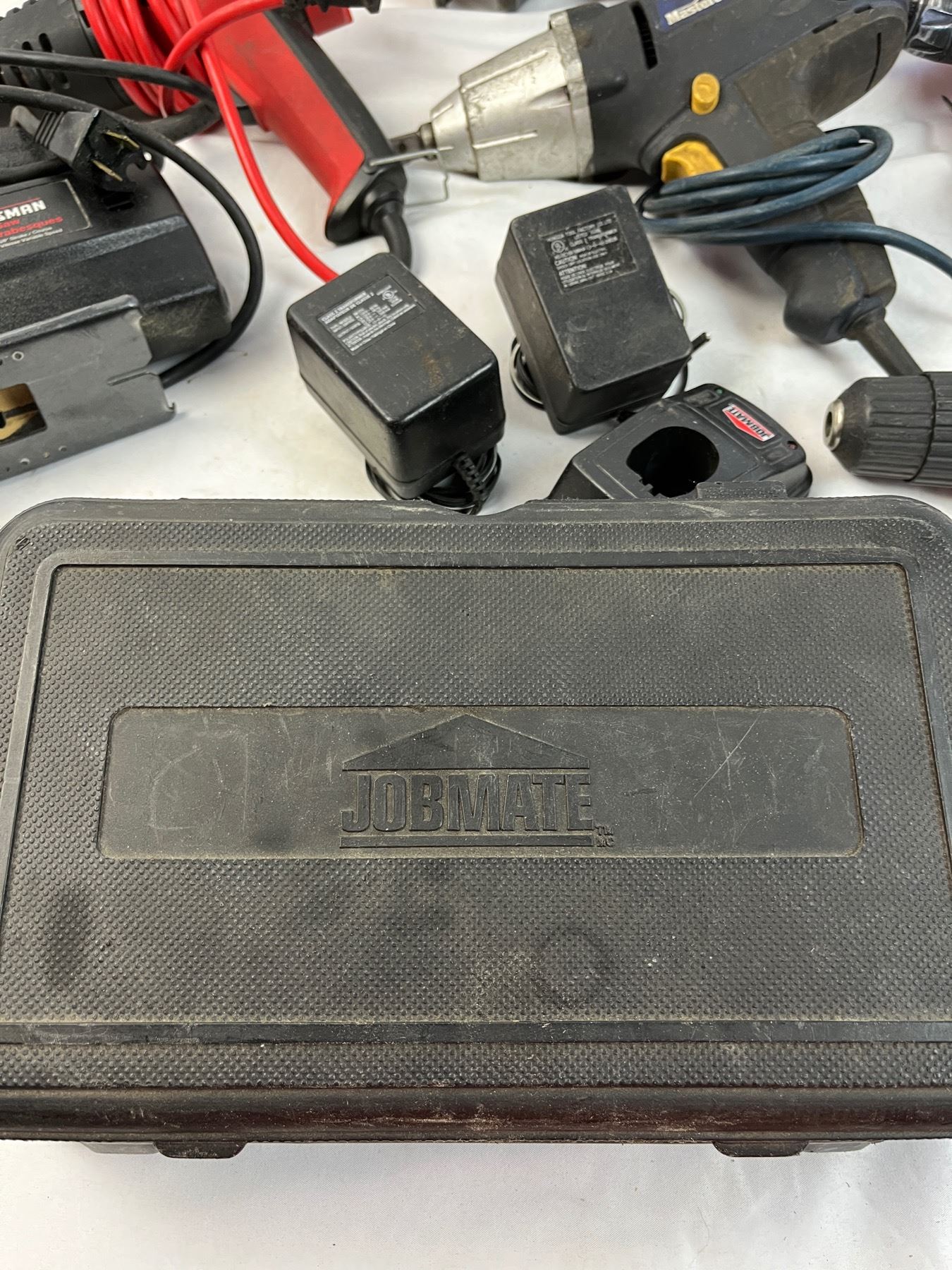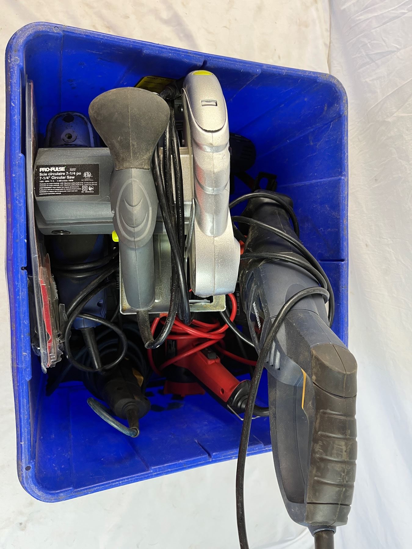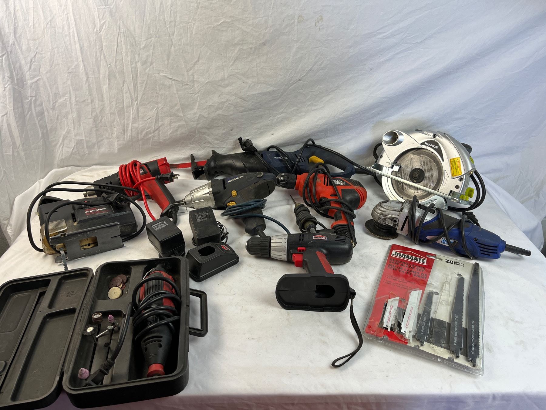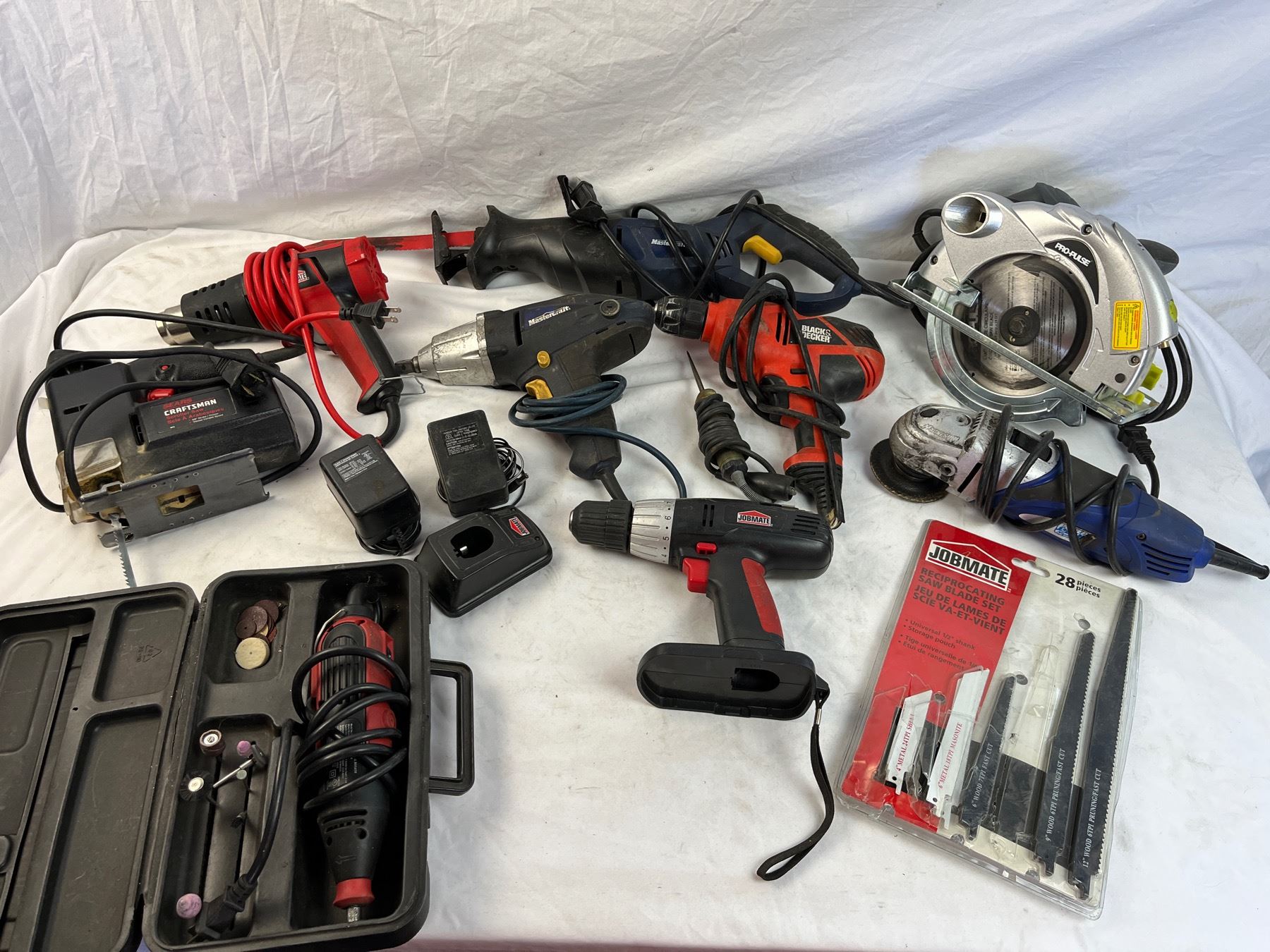 Including propulse saw, black and decker drill, mastercraft sawzall and various other power tools, some battery and charger missing.