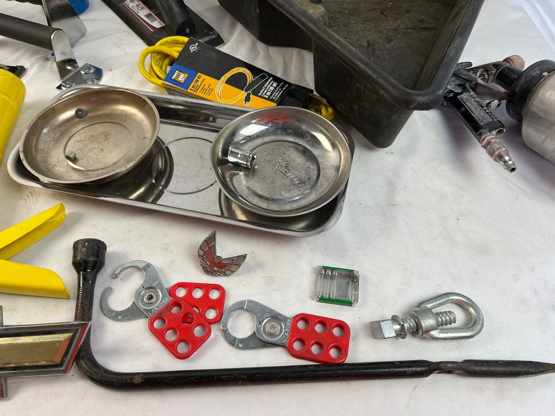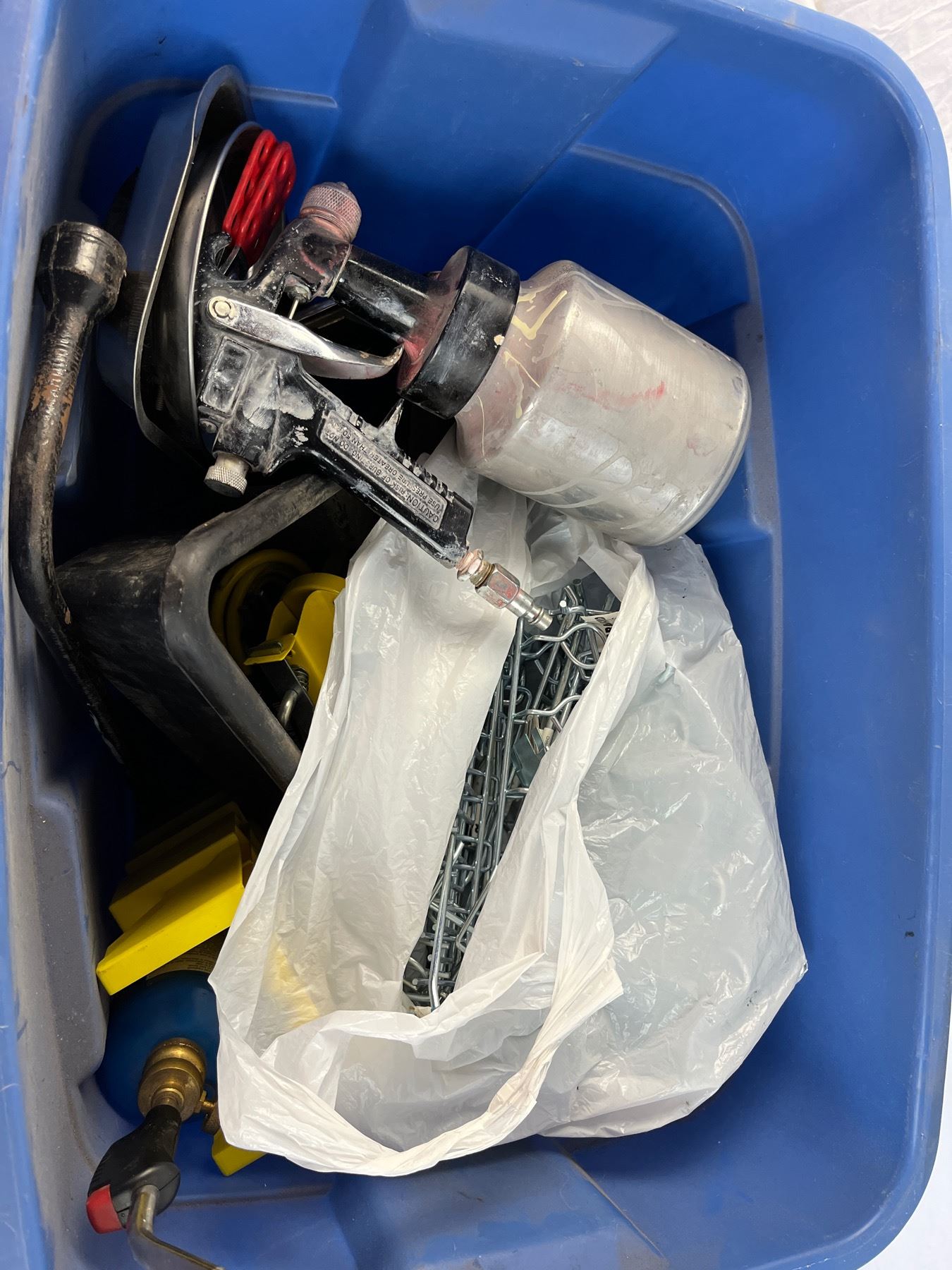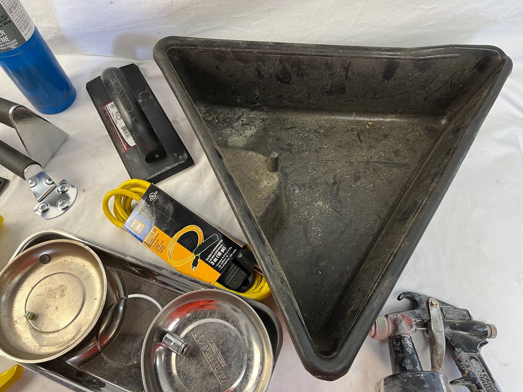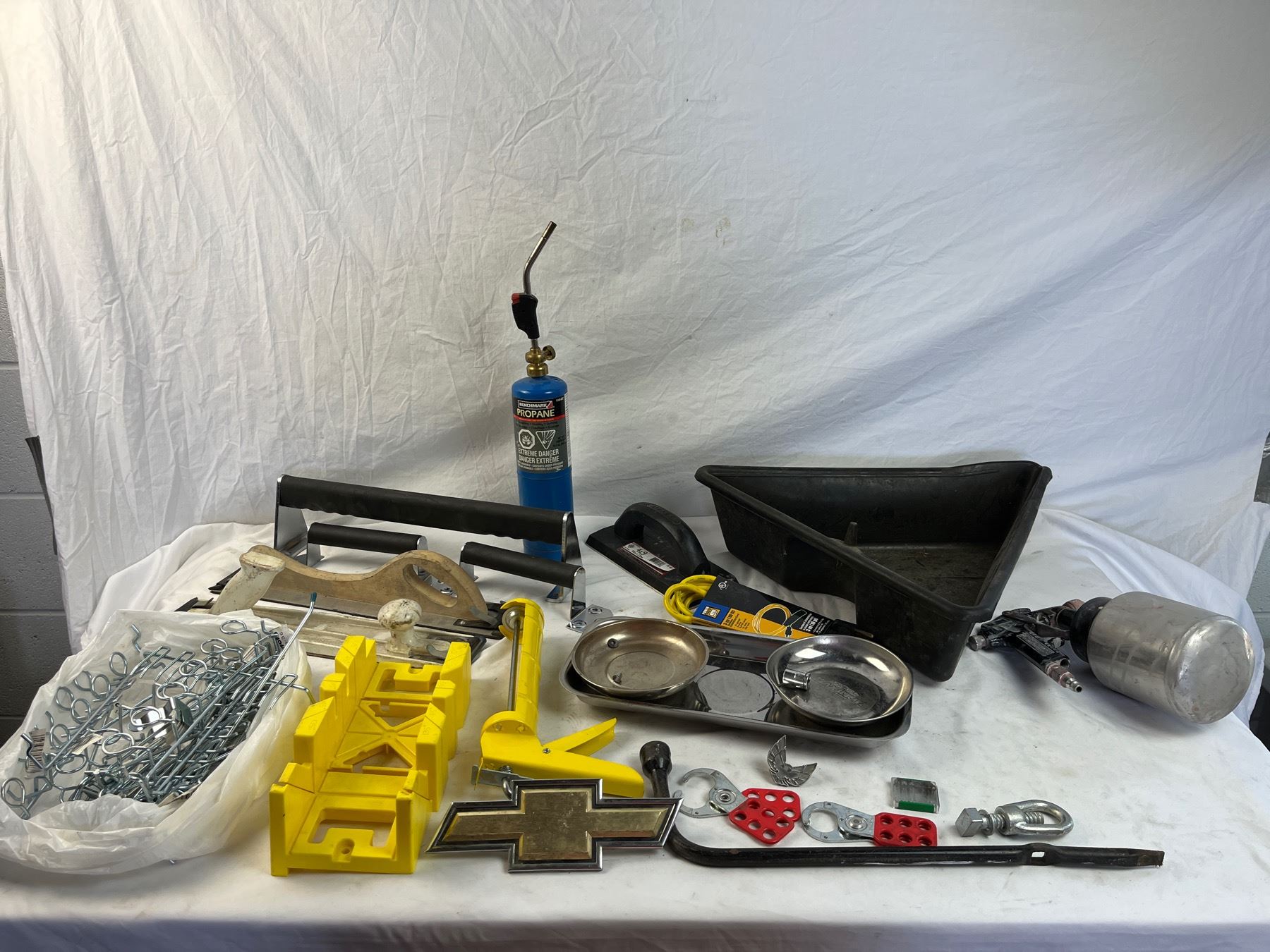 Including bag of wall mount screwdriver holders, spray gun, drip pans, torch, and miscellanious other items.