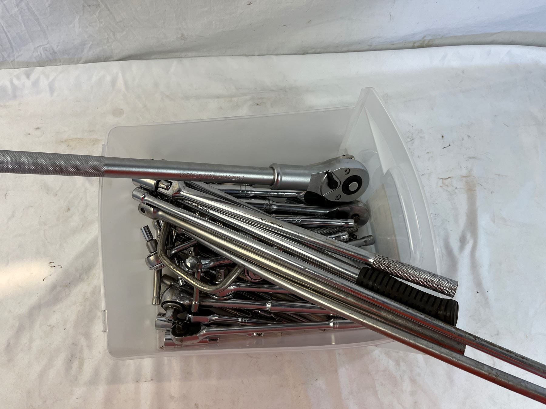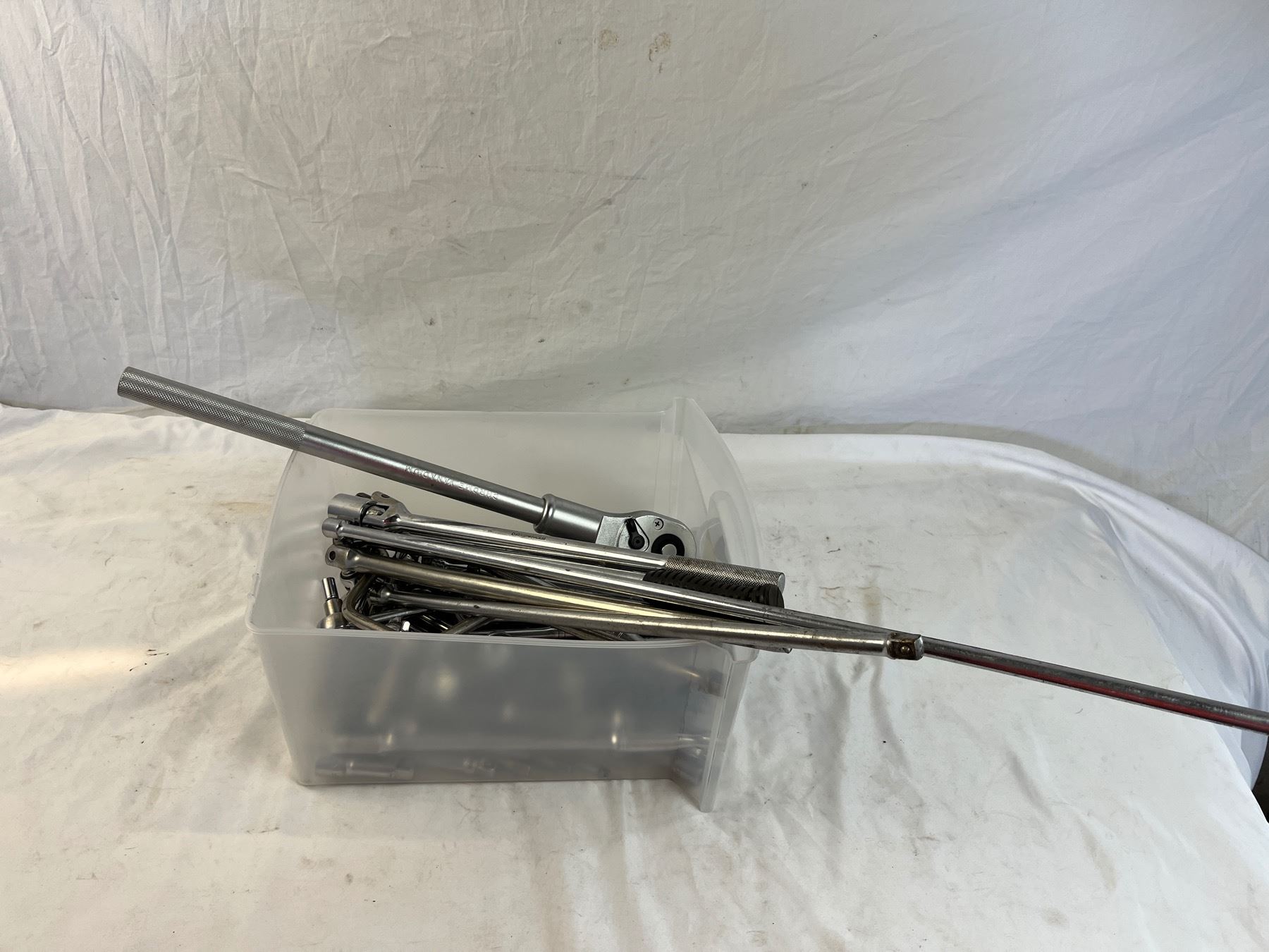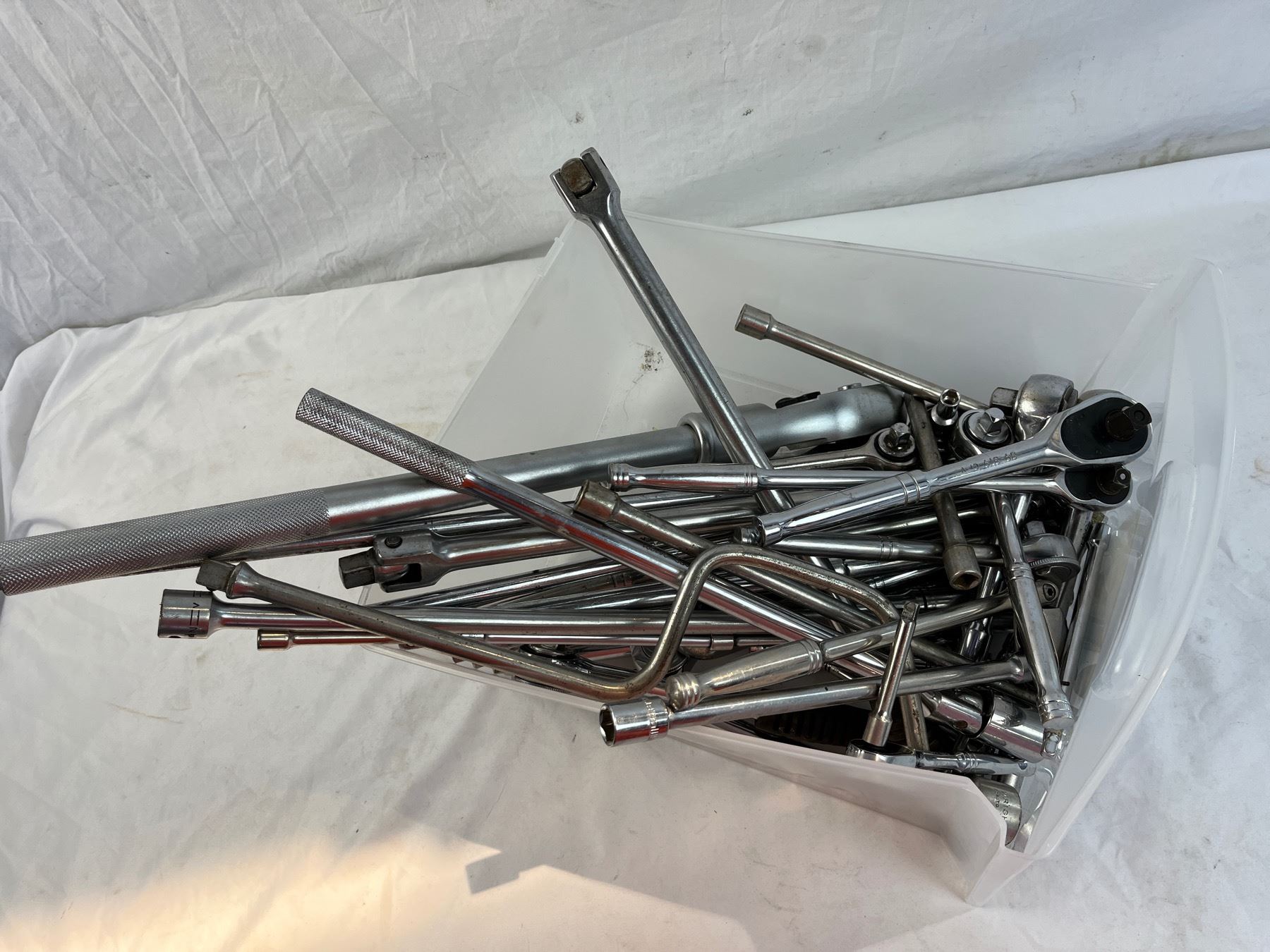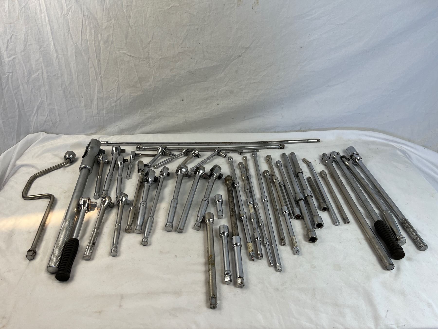 Large lot of socket wrenches and extensions in various sizes from short handle to heavy duty 19.5" wrench.
