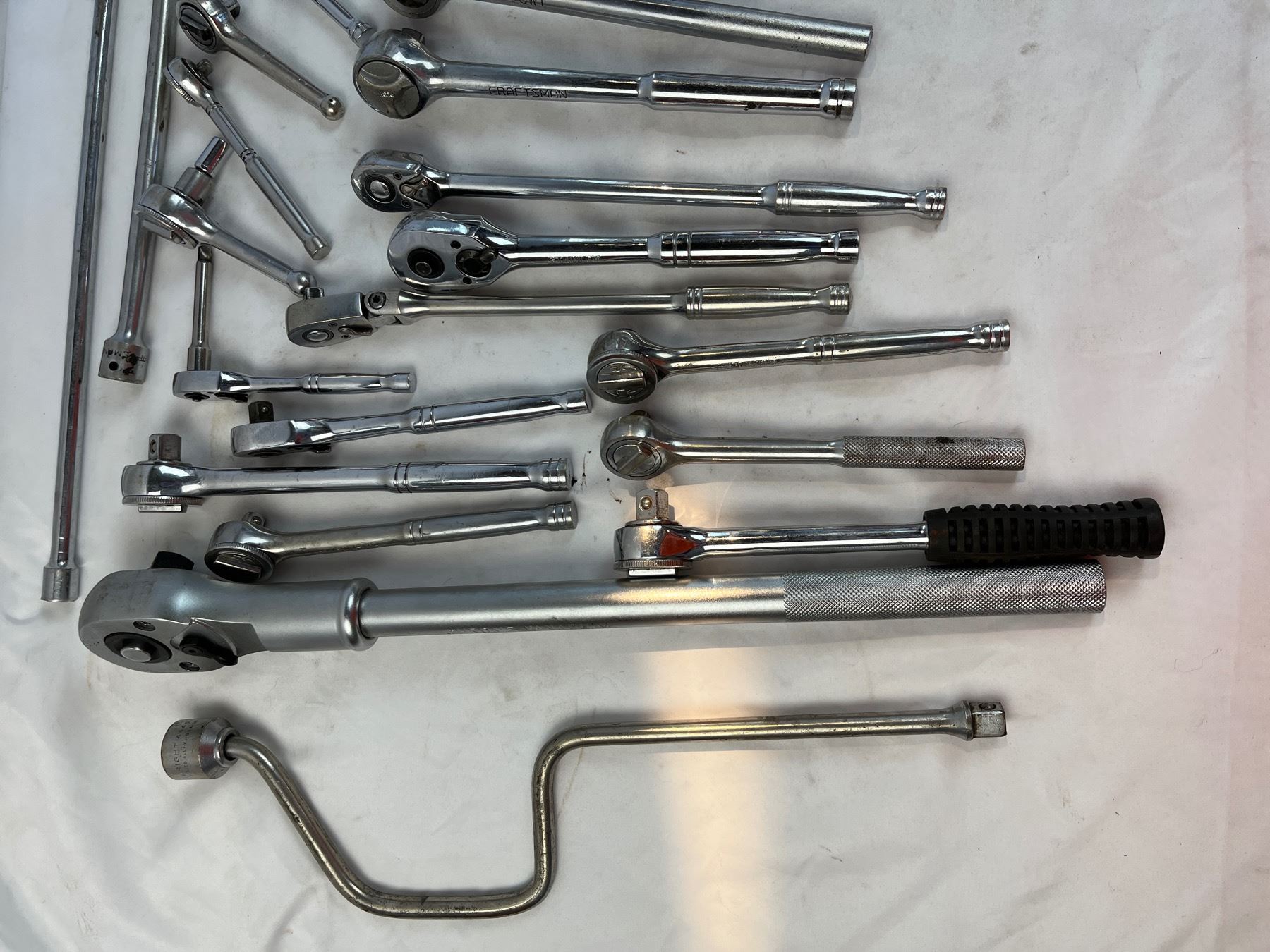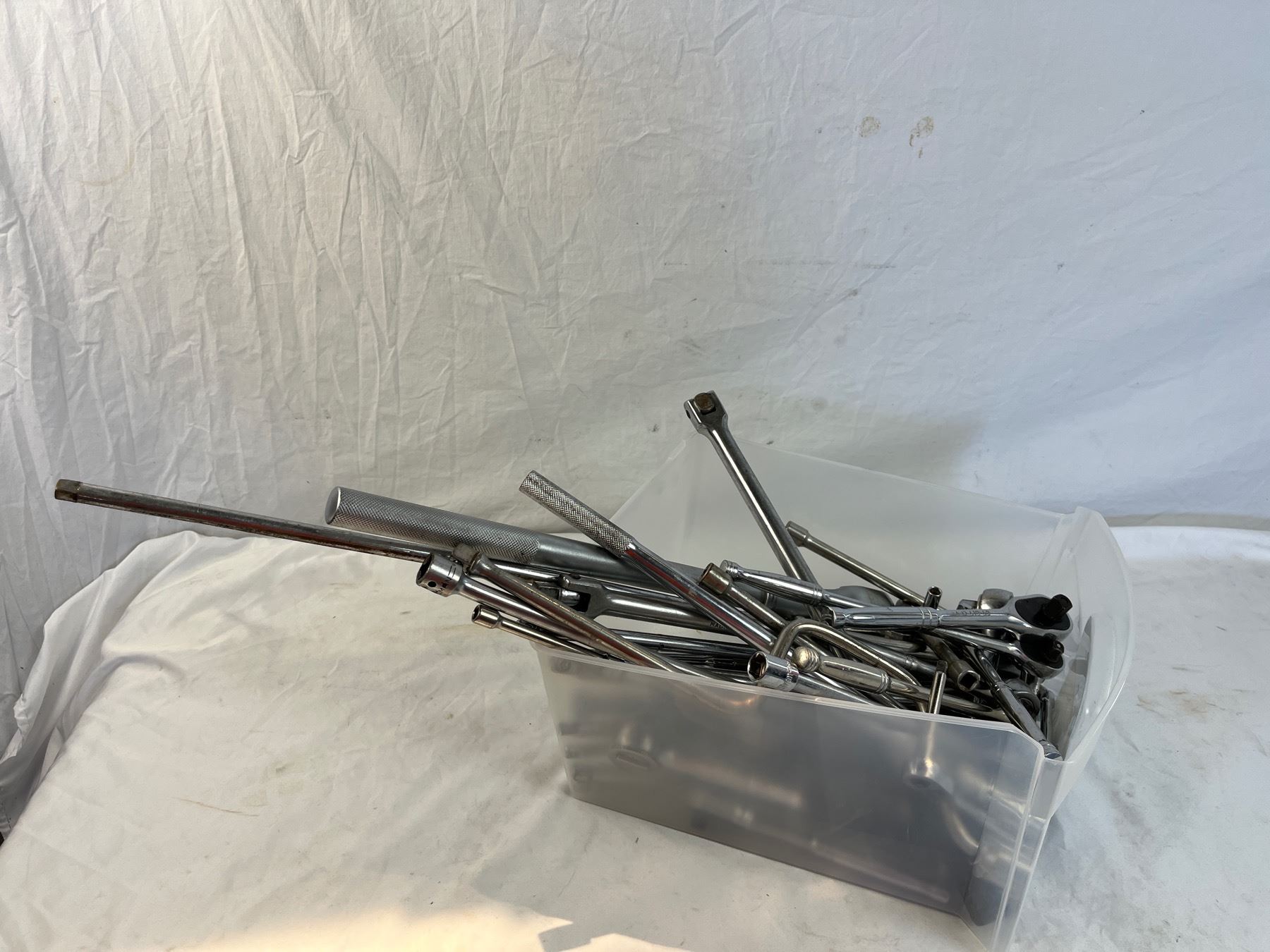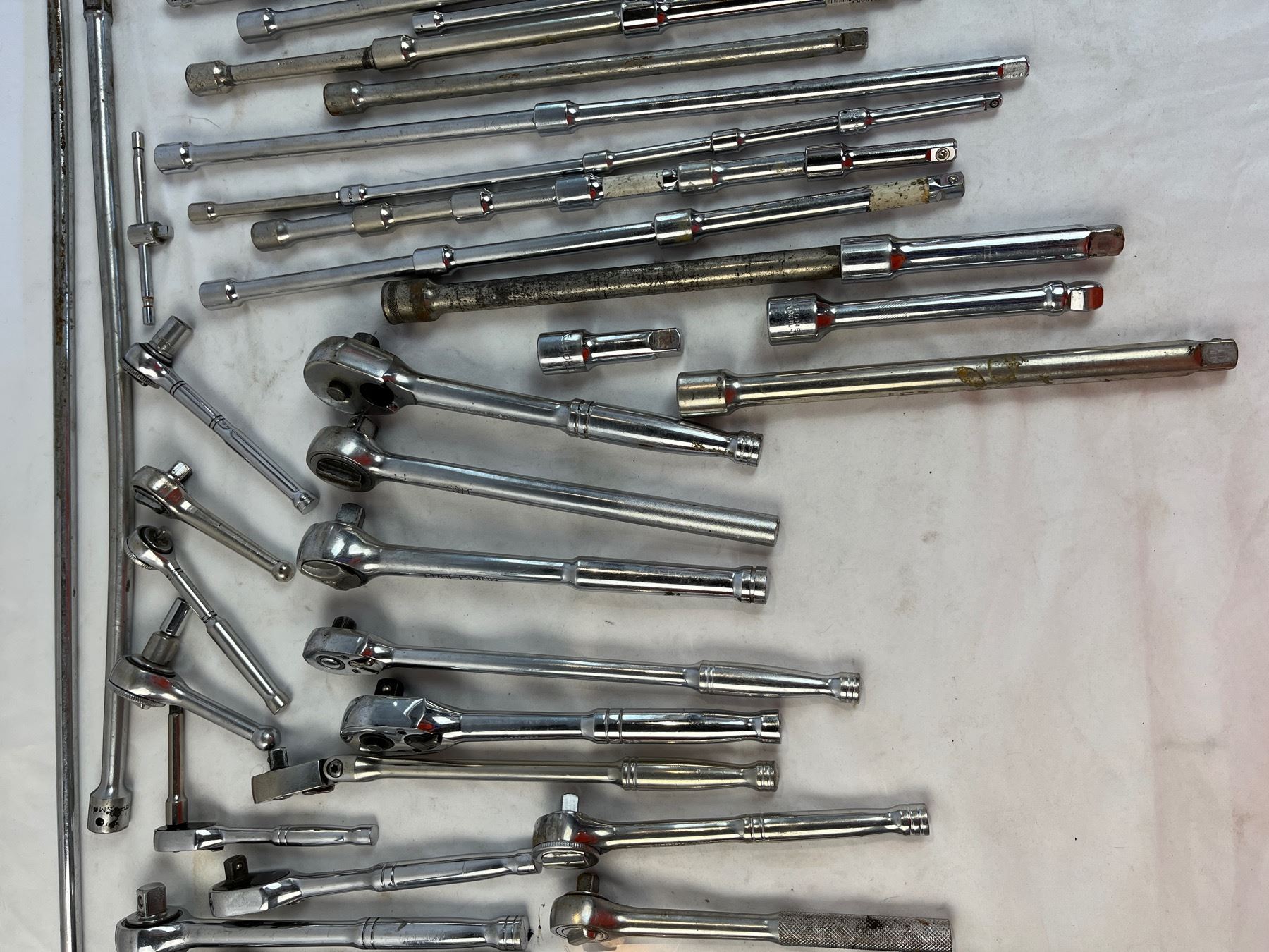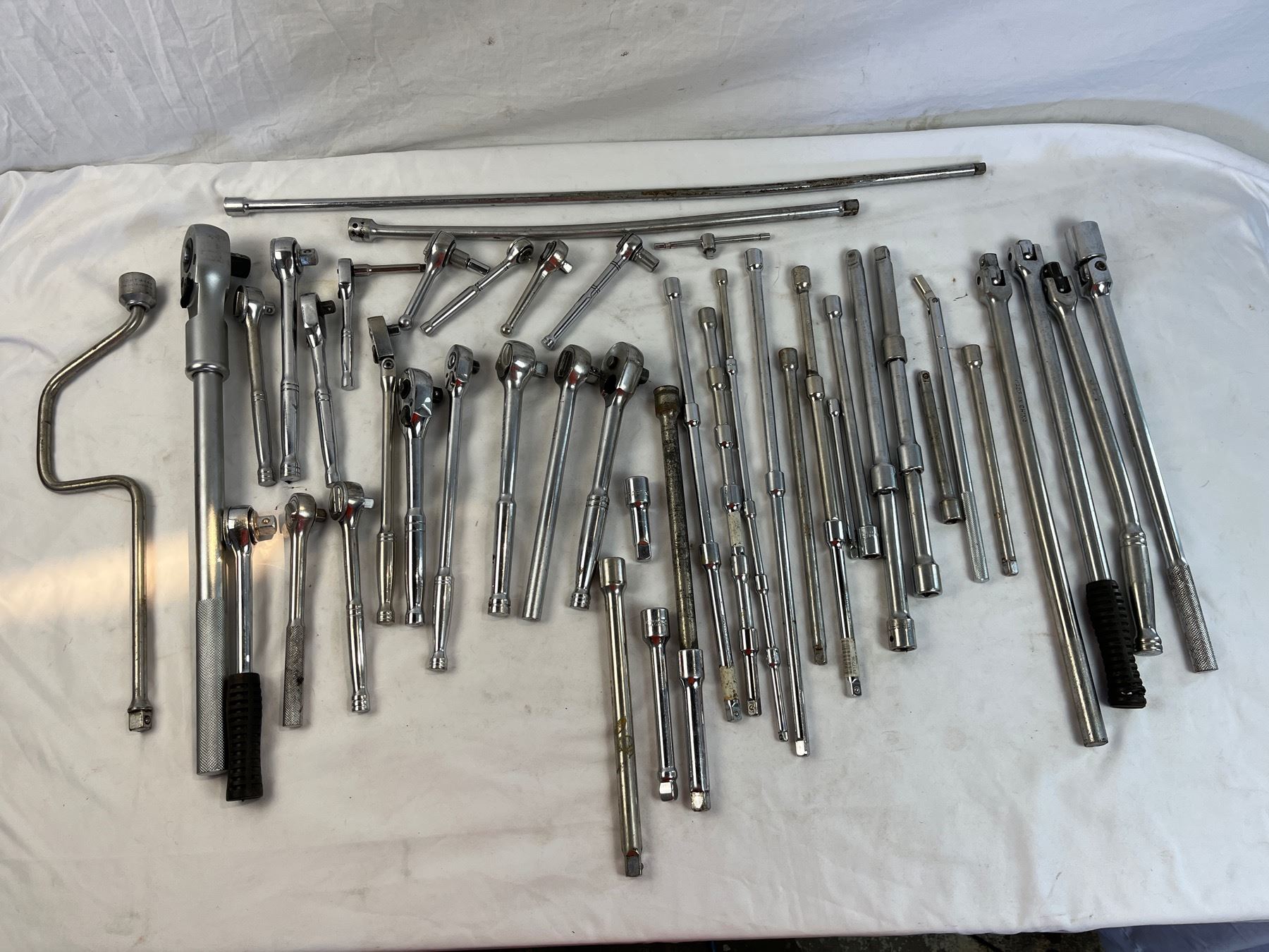 Large lot of socket wrenches and extensions in various sizes from short handle to heavy duty 19.5" wrench.