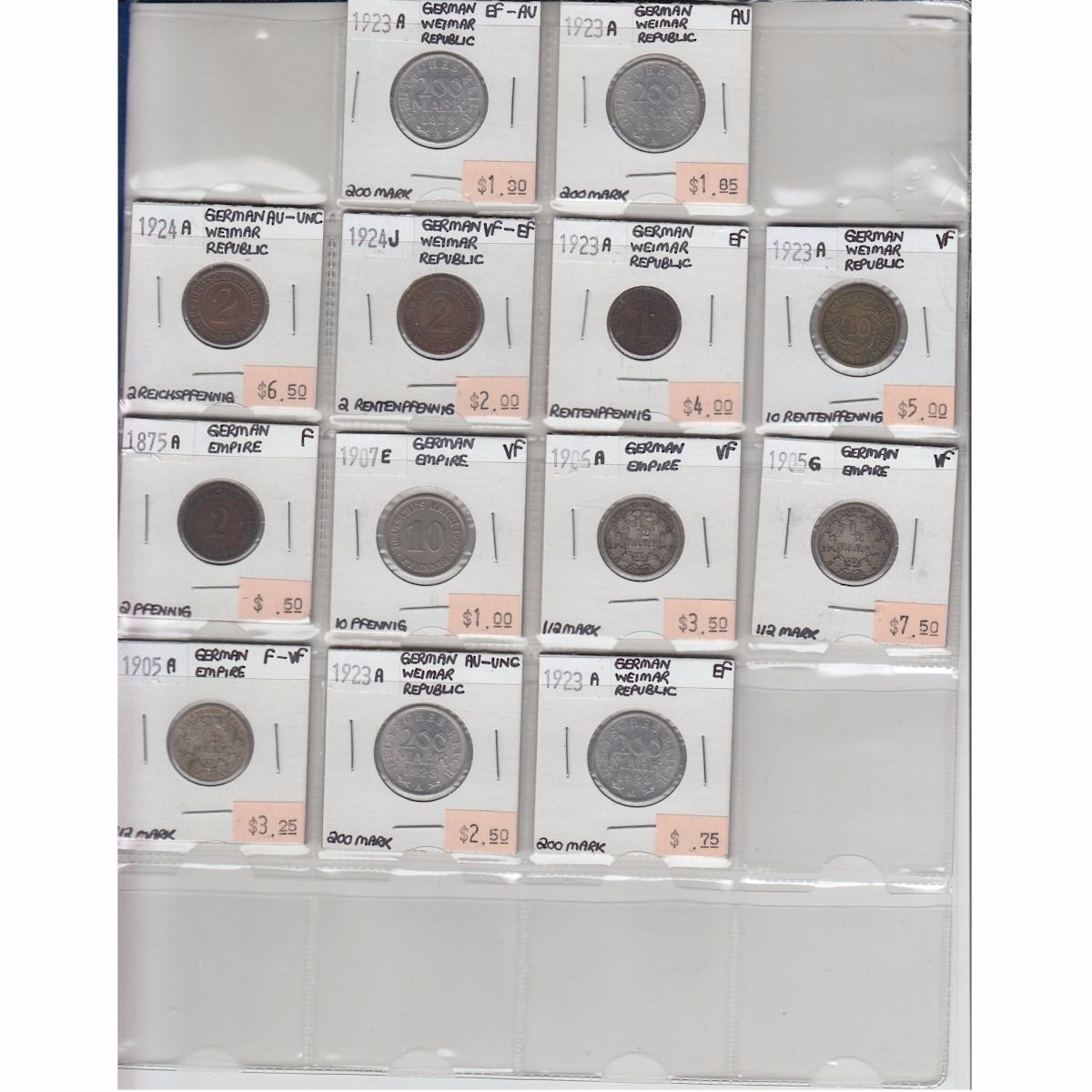 Mixed page of 13 x German Empire/Weimar Republic coins- oldest date 1875. Buyers Premium will be added on all items as per our terms of sale. We accept Paypal, Credit Card, E-Transfer Payments, Cheque or Money Orders (there is an additional 3% fee for using Paypal or Credit Card). All invoices will be emailed immediately following the auction, please contact us if you would like to pay by credit card or receive a new revised lower total for mailing in payment or sending an e-transfer (3% discount). All Items Are Sold "AS IS", no returns