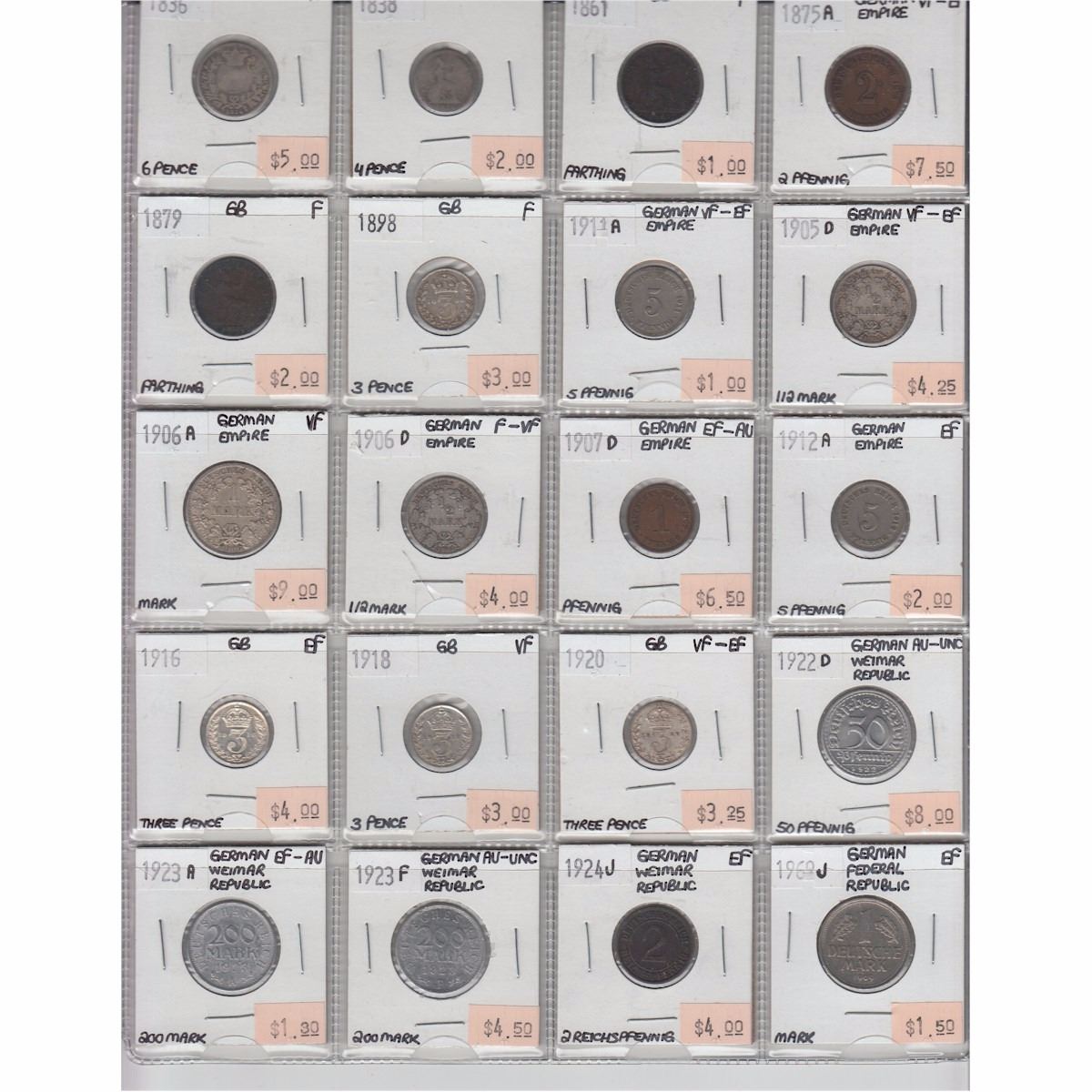 Mixed page of 20 x German Empire/Weimar Republic coins- oldest date 1836. Buyers Premium will be added on all items as per our terms of sale. We accept Paypal, Credit Card, E-Transfer Payments, Cheque or Money Orders (there is an additional 3% fee for using Paypal or Credit Card). All invoices will be emailed immediately following the auction, please contact us if you would like to pay by credit card or receive a new revised lower total for mailing in payment or sending an e-transfer (3% discount). All Items Are Sold "AS IS", no returns