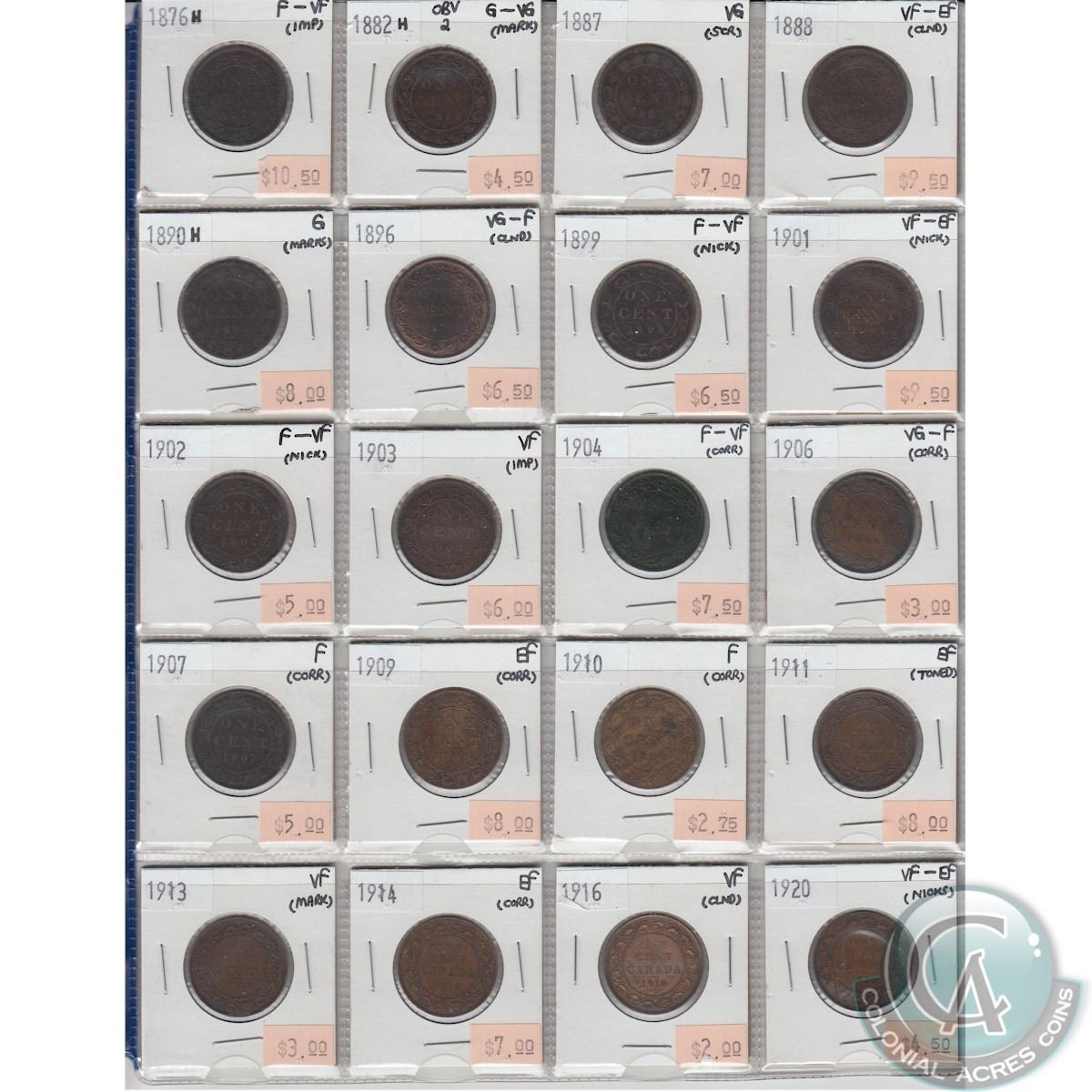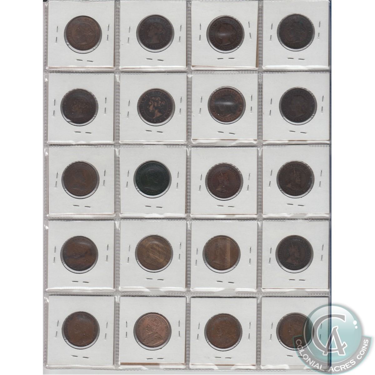 Mixed page of 20x Canada Large 1-cent Coins - Oldest Date 1876. Sold as is, No returns. Please view scans