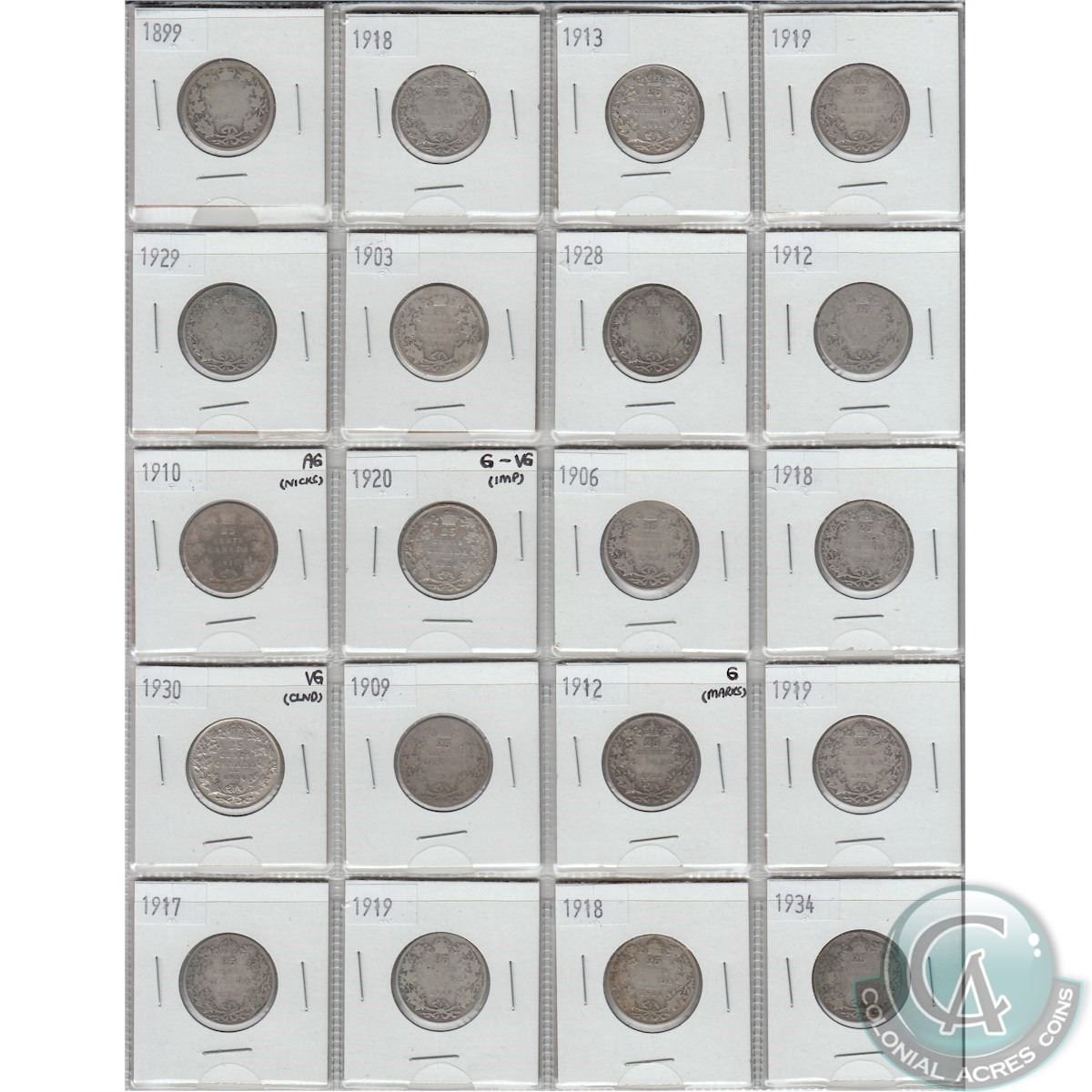 Mixed page of 20x Canada Silver 25-cent coins - Oldest Date 1899