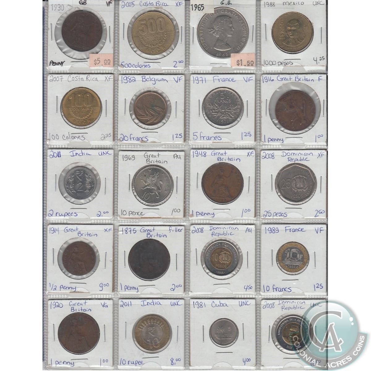 Mixed page of 20x Coins from Around the World - Oldest date 1875. Sold as is, No returns. Please view scans