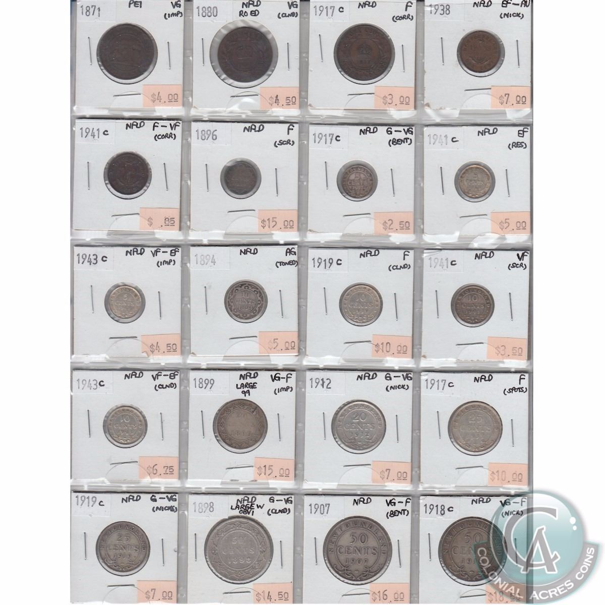 Mixed page of 20x Newfoundland Silver Coins - Oldest Date 1871. Please view scan, no return on this item.