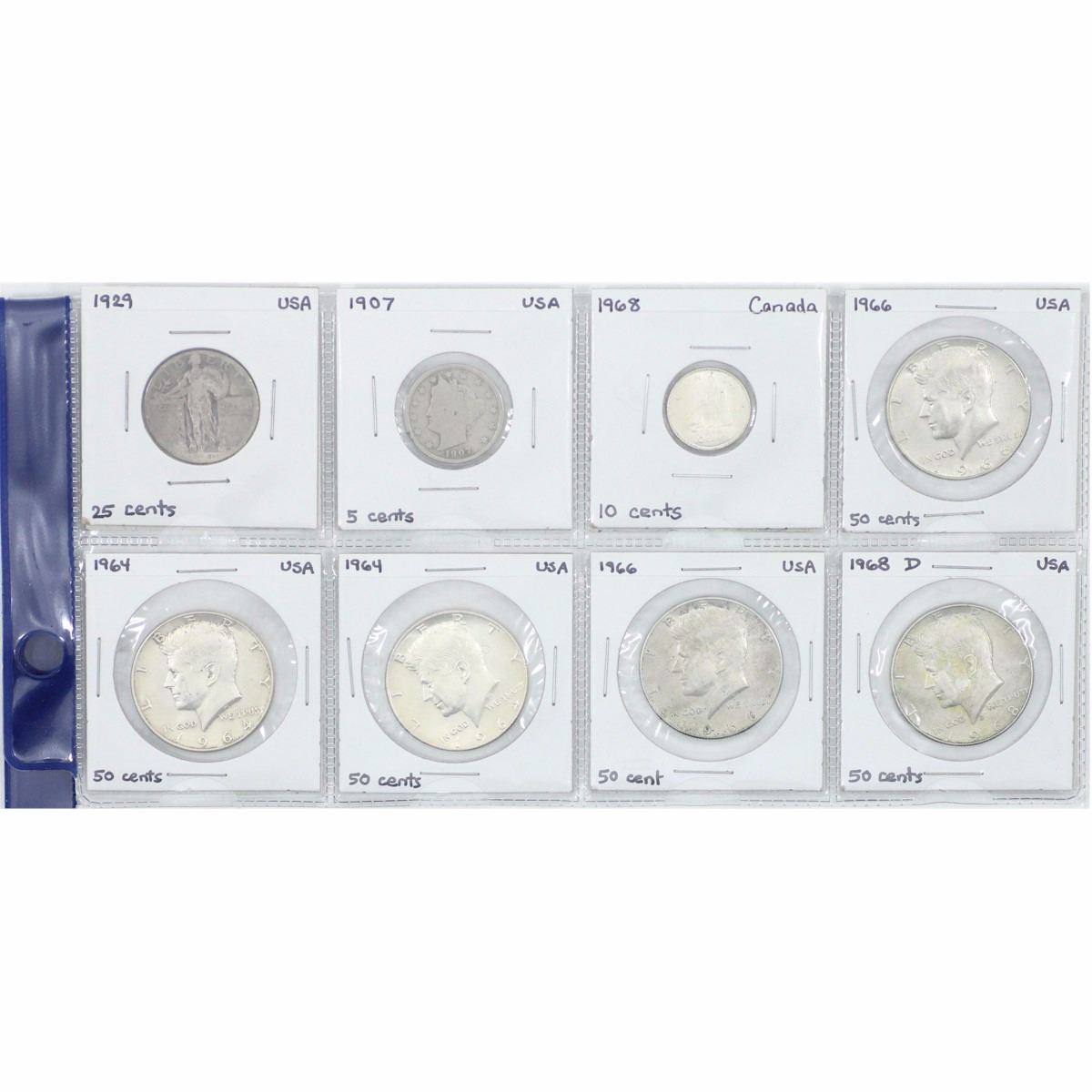 Mixed page of 8 Canadian and United States Decimal coins-Oldest Date 1907