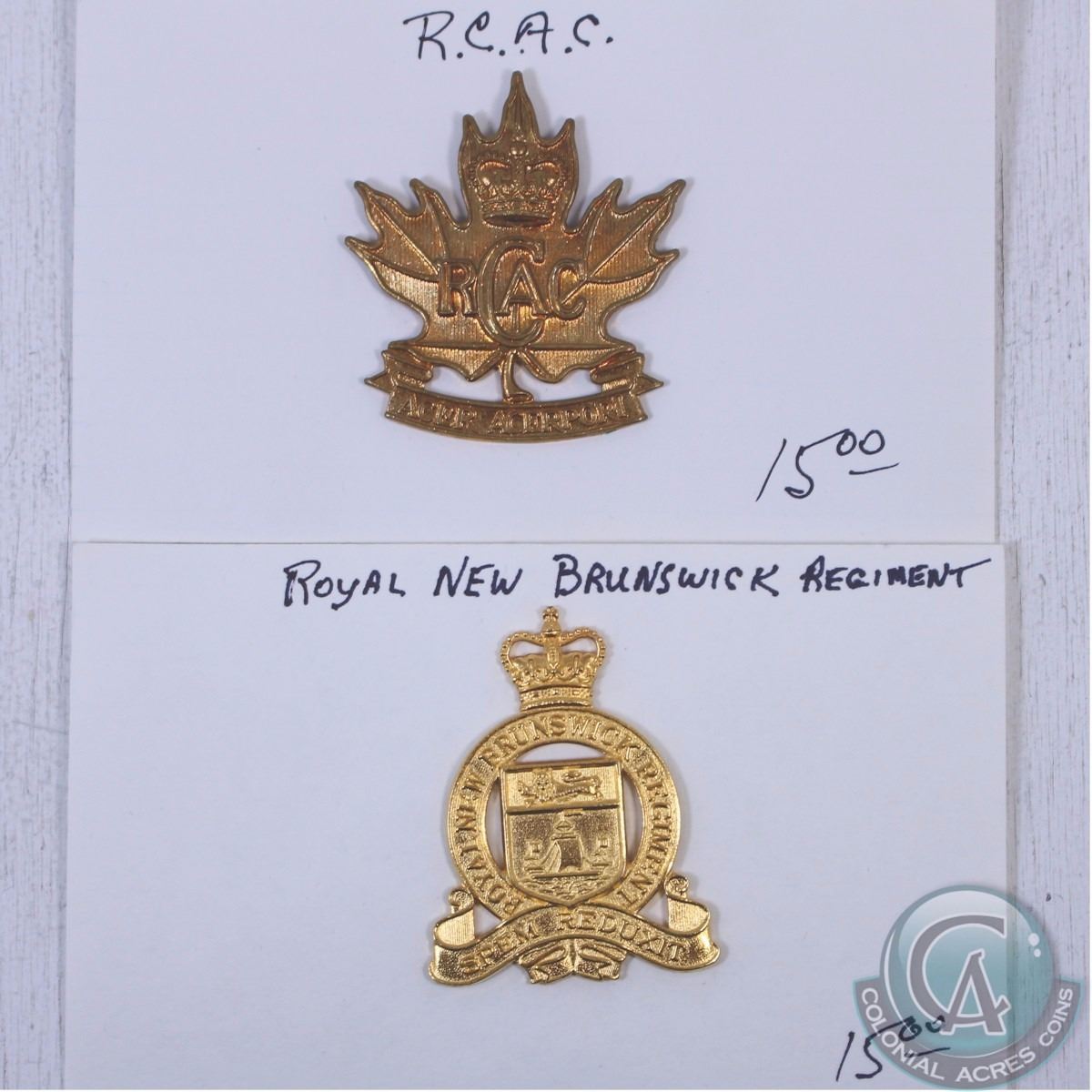 Mixed pair of Canadian Badges. You will receive the Royal Canadian Army Cadets and the Royal New Brunswick Regiment. 2 pcs