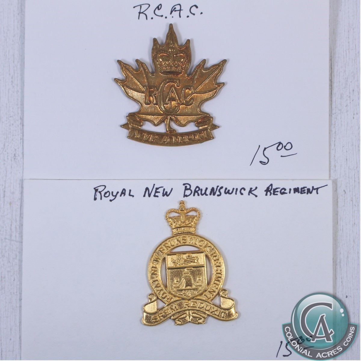 Mixed pair of Canadian Badges. You will receive the Royal Canadian Army Cadets and the Royal New Brunswick Regiment. 2 pcs