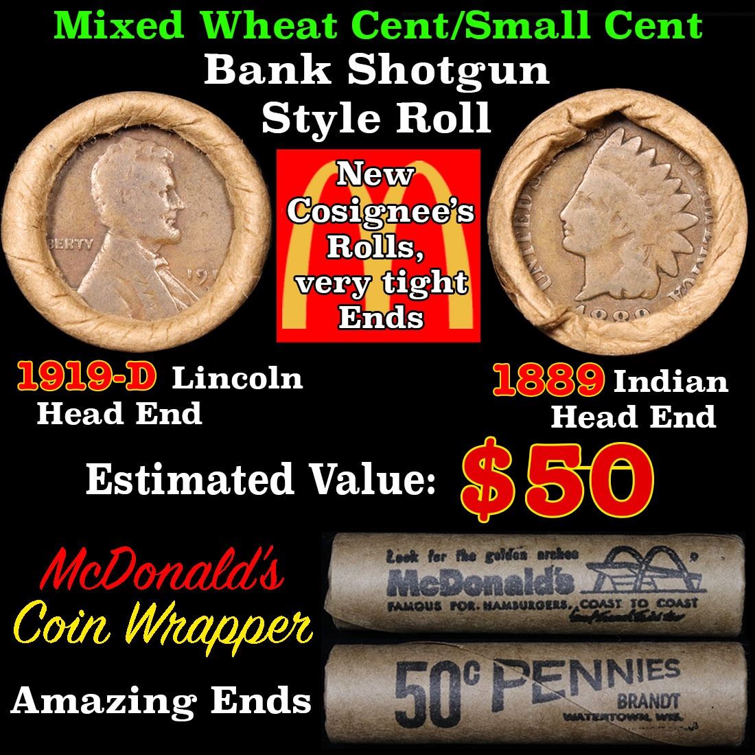 Mixed small cents 1c McDonald's wrapper shotgun roll, 1919-d Wheat Cent, 1889 Indian Cent other end. The roll is held in an old Rare & Collectable McDonalds Brandt wrapper. Actual roll pictured is the roll you will get. A great original bank shotgun roll with very tight ends. We have opened a few of these rolls. They seem to be mixed small cents including Indians, Wheats, Steel cents & some Flying Eagles mixed in. These shotgun rolls are all from a new consignee. They are all frrom one Estate.