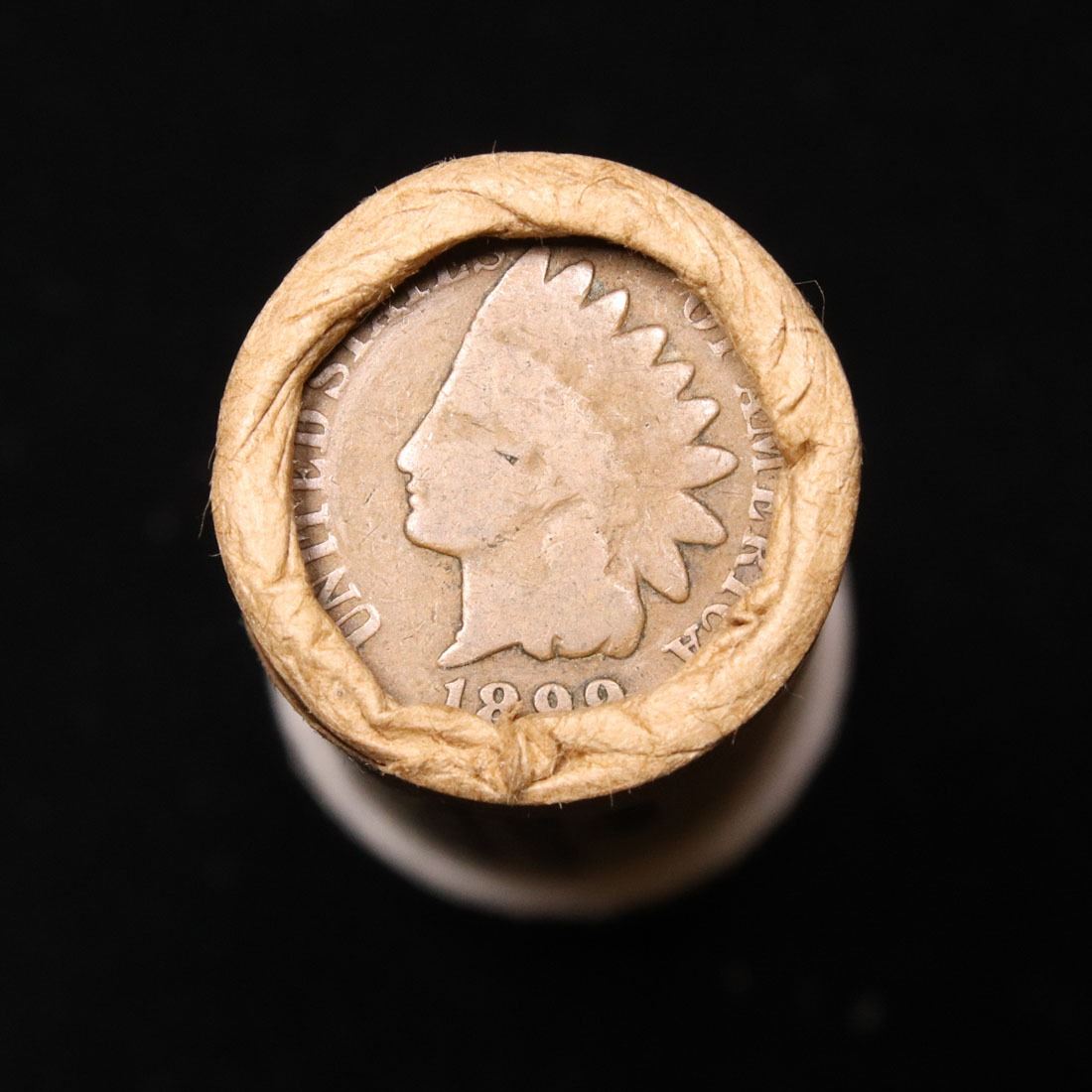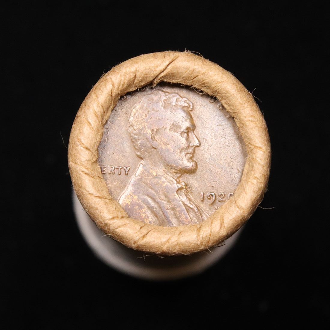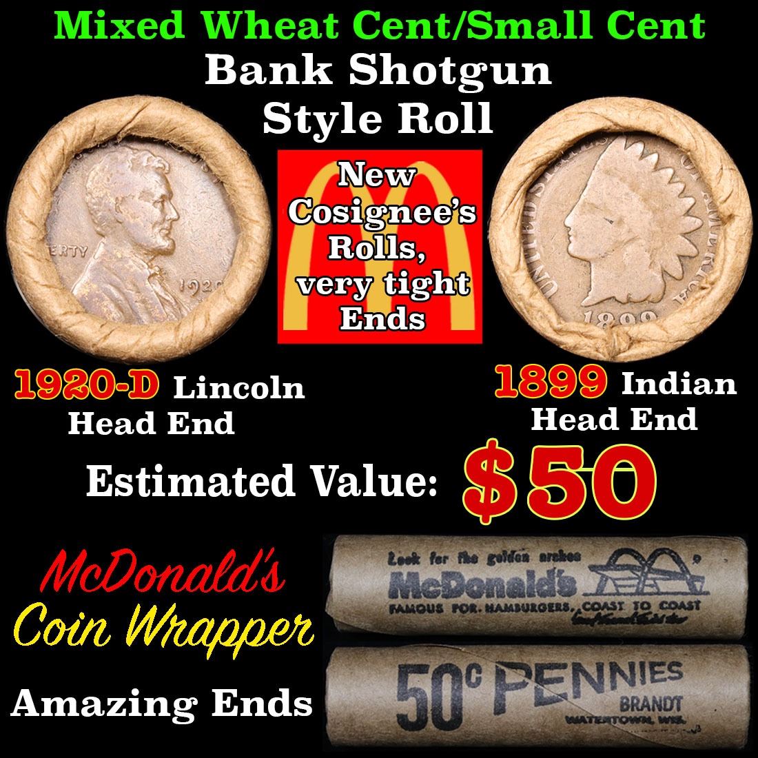Mixed small cents 1c McDonald's wrapper shotgun roll, 1920-d Wheat Cent, 1899 Indian Cent other end. The roll is held in an old Rare & Collectable McDonalds Brandt wrapper. Actual roll pictured is the roll you will get. A great original bank shotgun roll with very tight ends. We have opened a few of these rolls. They seem to be mixed small cents including Indians, Wheats, Steel cents & some Flying Eagles mixed in. These shotgun rolls are all from a new consignee. They are all frrom one Estate.